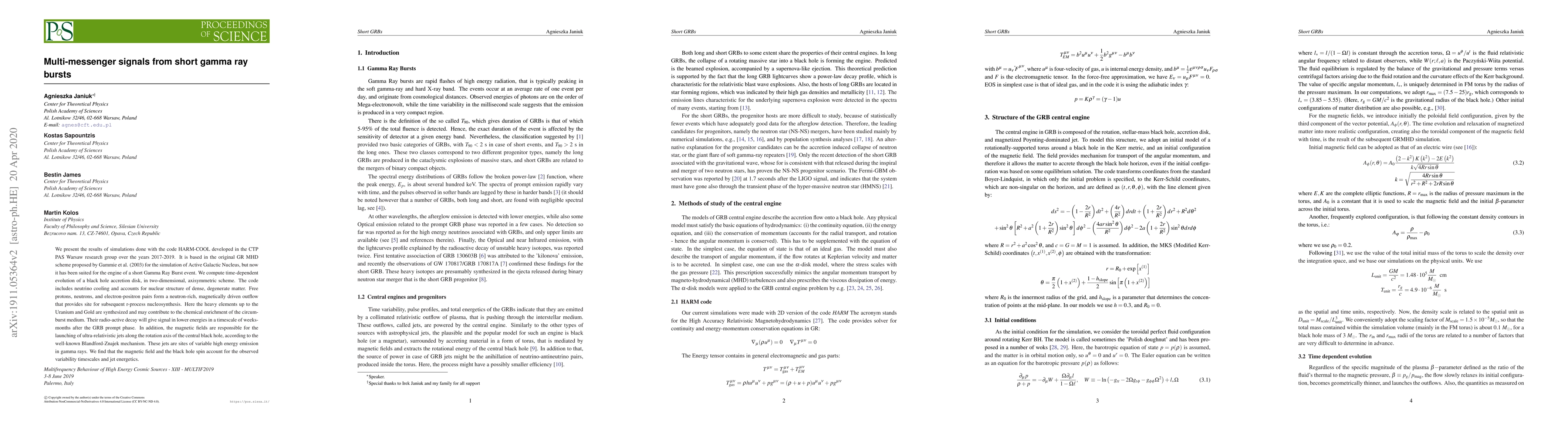 We present the results of simulations done with the code HARM-COOL developed in the CTP PAS Warsaw research group over the years 2017-2019. It is based in the original GR MHD scheme proposed by Gammie et al. (2003) for the simulation of Active Galactic Nucleus, but now it has been suited for the engine of a short Gamma Ray Burst event. We compute time-dependent evolution of a black hole accretion disk, in two-dimensional, axisymmetric scheme. The code includes neutrino cooling and accounts for nuclear structure of dense, degenerate matter. Free protons, neutrons, and electron-positron pairs form a neutron-rich, magnetically driven outflow that provides site for subsequent r-process nucleosynthesis. Here the heavy elements up to the Uranium and Gold are synthesized and may contribute to the chemical enrichment of the circum-burst medium. Their radio-active decay will give signal in lower energies in a timescale of weeks-months after the GRB prompt phase. In addition, the magnetic fields are responsible for the launching of ultra-relativistic jets along the rotation axis of the central black hole, according to the well-known Blandford-Znajek mechanism. These jets are sites of variable high energy emission in gamma rays. We find that the magnetic field and the black hole spin account for the observed variability timescales and jet energetics.