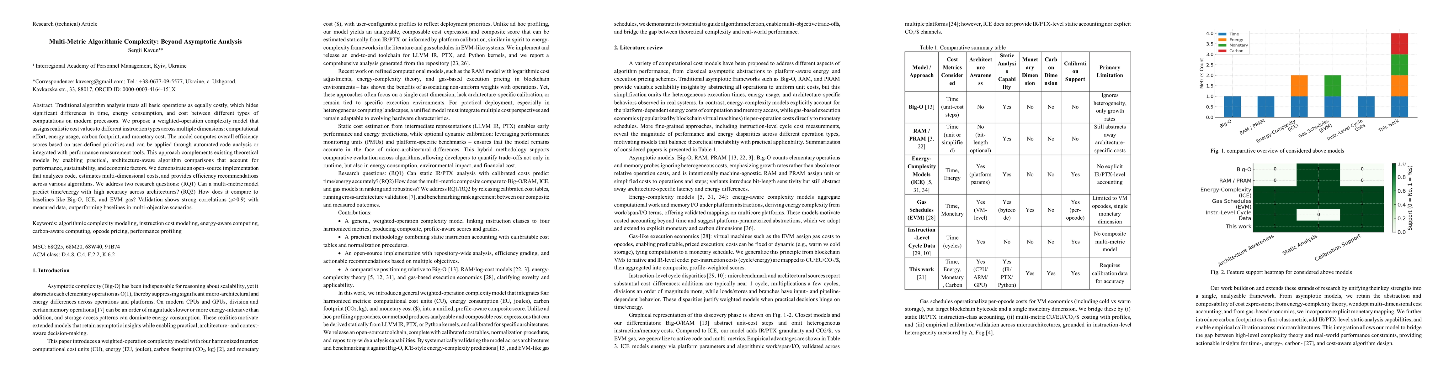 Traditional algorithm analysis treats all basic operations as equally costly, which hides significant differences in time, energy consumption, and cost between different types of computations on modern processors. We propose a weighted-operation complexity model that assigns realistic cost values to different instruction types across multiple dimensions: computational effort, energy usage, carbon footprint, and monetary cost. The model computes overall efficiency scores based on user-defined priorities and can be applied through automated code analysis or integrated with performance measurement tools. This approach complements existing theoretical models by enabling practical, architecture-aware algorithm comparisons that account for performance, sustainability, and economic factors. We demonstrate an open-source implementation that analyzes code, estimates multi-dimensional costs, and provides efficiency recommendations across various algorithms. We address two research questions: (RQ1) Can a multi-metric model predict time/energy with high accuracy across architectures? (RQ2) How does it compare to baselines like Big-O, ICE, and EVM gas? Validation shows strong correlations (\r{ho}>0.9) with measured data, outperforming baselines in multi-objective scenarios.