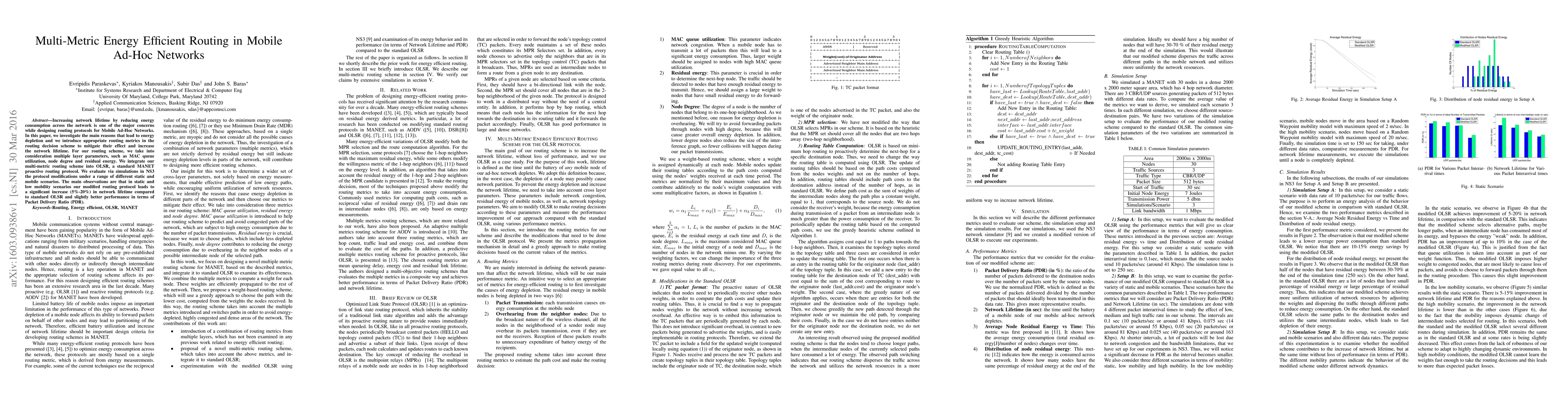 This paper proposes a multi-metric energy-efficient routing protocol for Mobile Ad-Hoc Networks (MANETs) that considers parameters like MAC queue utilization, node degree, and residual energy to enhance network lifetime. The modified OLSR protocol shows a 5%-20% increase in network lifetime and improved Packet Delivery Ratio in static and low mobility scenarios compared to standard OLSR.