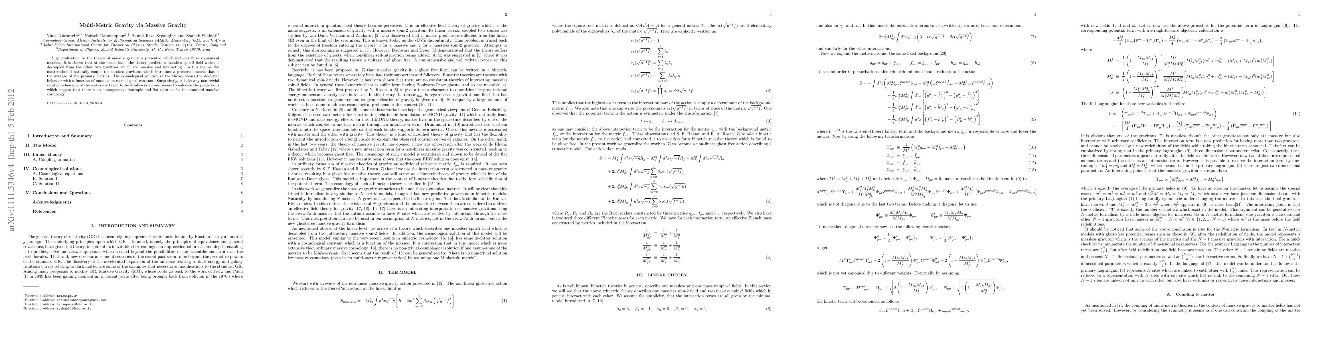A generalization to the theory of massive gravity is presented which includes three dynamical metrics. It is shown that at the linear level, the theory predicts a massless spin-2 field which is decoupled from the other two gravitons which are massive and interacting. In this regime the matter naturally should be coupled to massless graviton which introduces a preferred metric that is the average of the primary metrics. The cosmological solution of the theory shows the de-Sitter behavior with a function of mass as its cosmological constant. Surprisingly, it lacks any non-trivial solution when one of the metrics is taken to be Minkowskian and seems to enhance the predictions which suggests that there is no homogeneous, isotropic and flat solution for the standard massive cosmology.