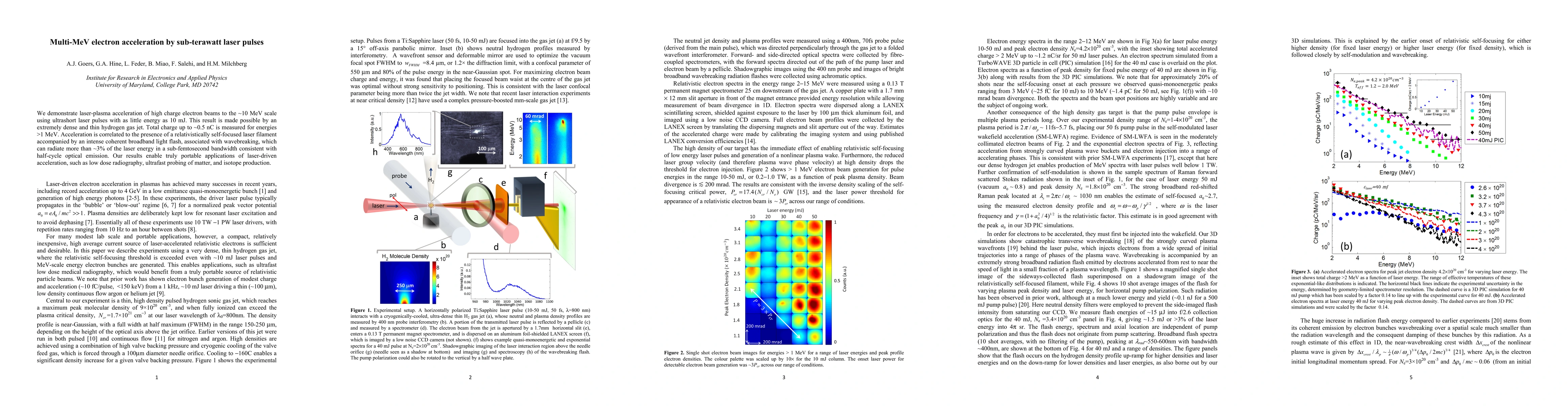 This research demonstrates the acceleration of electron beams to ~10 MeV using sub-terawatt laser pulses as little as 10 mJ, facilitated by a dense hydrogen gas jet, with potential applications in radiography, ultrafast matter probing, and isotope production. The acceleration mechanism involves relativistically self-focused laser filaments and intense coherent light emissions.