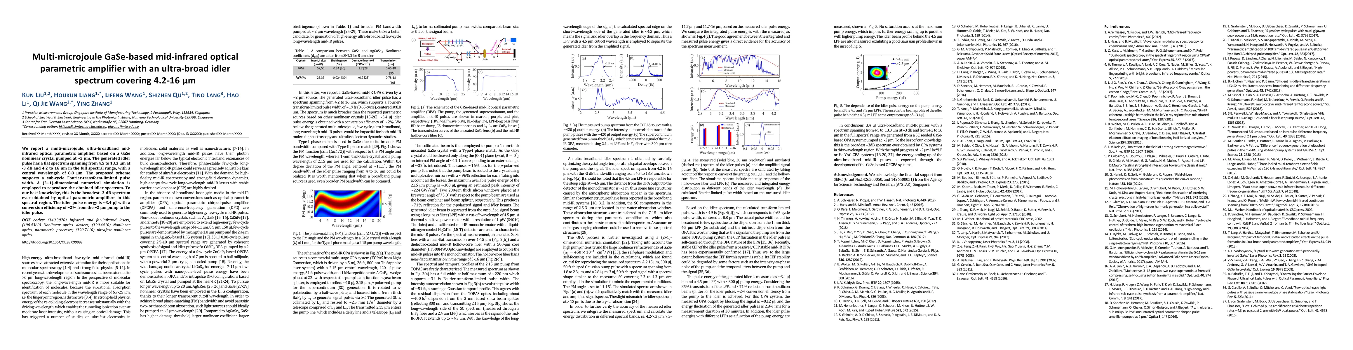 This paper presents a GaSe-based mid-infrared optical parametric amplifier generating multi-microjoule idler pulses with an ultra-broad spectrum from 4.2 to 16 μm. The amplifier achieves a -3 dB bandwidth from 4.5 to 13.3 μm, with a central wavelength of 8.8 μm, and a conversion efficiency of 2%.
