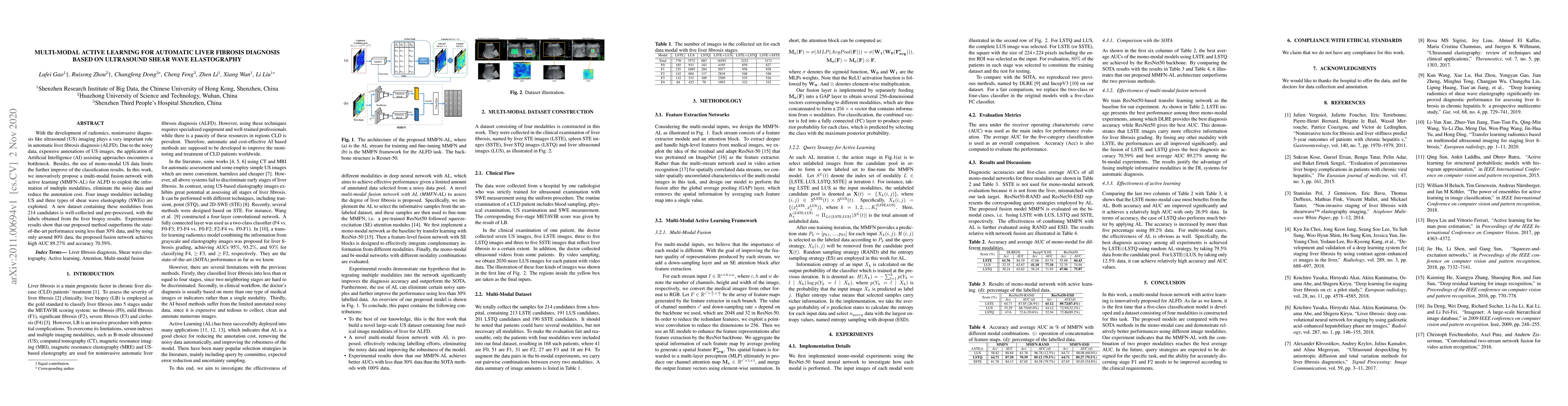This paper proposes a multi-modal fusion network with active learning (MMFN-AL) to enhance automatic liver fibrosis diagnosis using ultrasound shear wave elastography. The method effectively integrates multiple imaging modalities to improve classification results while reducing annotation costs and eliminating noisy data.