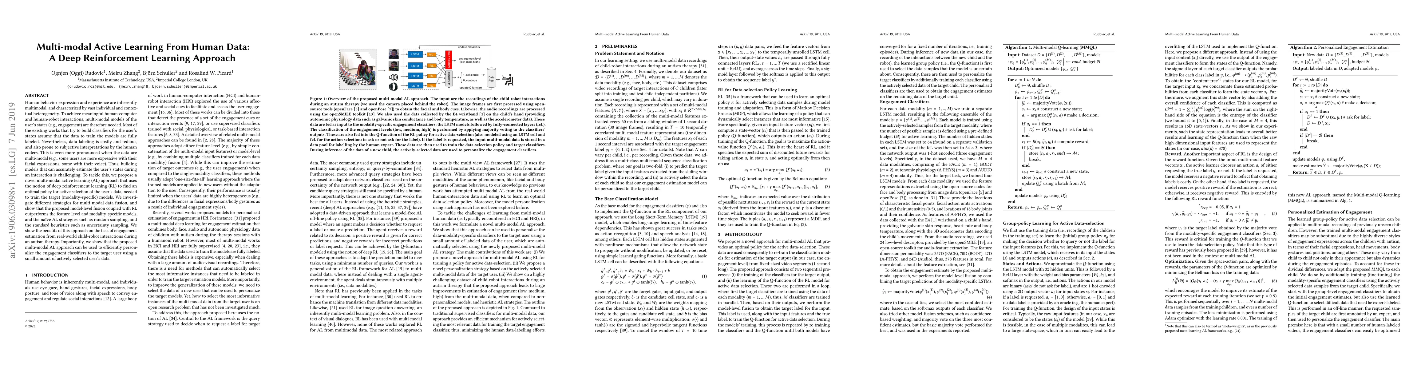This paper proposes a multi-modal active learning approach using deep reinforcement learning to optimally select user data for training engagement classifiers, addressing the challenges of costly and subjective data labeling. The method outperforms traditional heuristics and achieves better performance through model-level fusion, demonstrated in the context of autism therapy child-robot interactions.