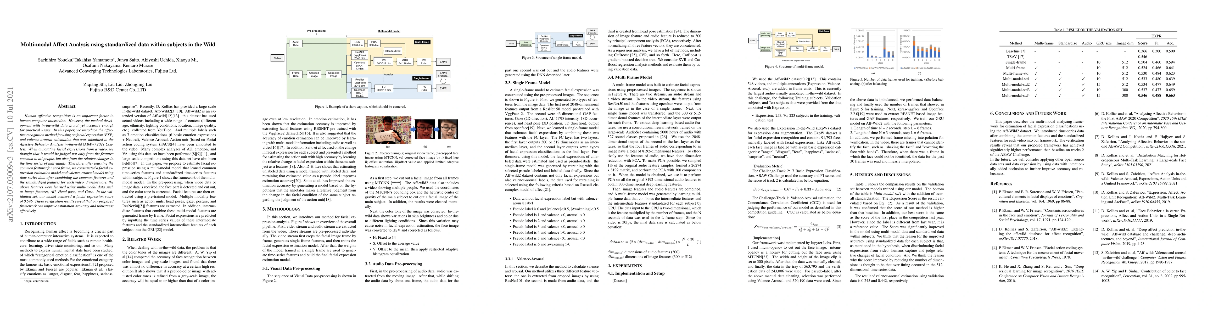 Human affective recognition is an important factor in human-computer interaction. However, the method development with in-the-wild data is not yet accurate enough for practical usage. In this paper, we introduce the affective recognition method focusing on facial expression (EXP) and valence-arousal calculation that was submitted to the Affective Behavior Analysis in-the-wild (ABAW) 2021 Contest. When annotating facial expressions from a video, we thought that it would be judged not only from the features common to all people, but also from the relative changes in the time series of individuals. Therefore, after learning the common features for each frame, we constructed a facial expression estimation model and valence-arousal model using time-series data after combining the common features and the standardized features for each video. Furthermore, the above features were learned using multi-modal data such as image features, AU, Head pose, and Gaze. In the validation set, our model achieved a facial expression score of 0.546. These verification results reveal that our proposed framework can improve estimation accuracy and robustness effectively.