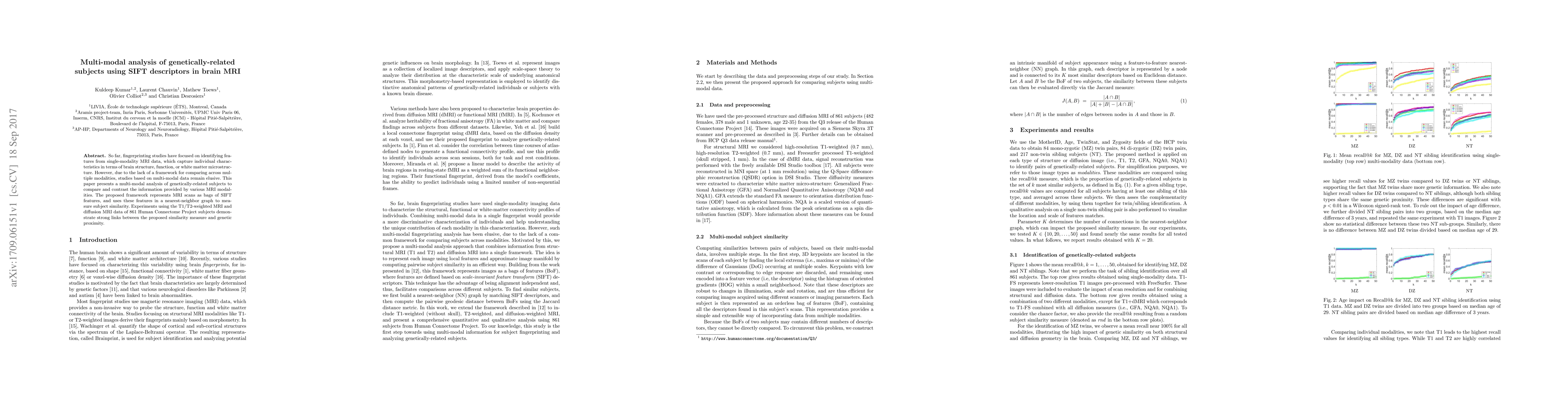 This paper introduces a framework for multi-modal analysis of genetically-related subjects using SIFT descriptors in brain MRI to compare different MRI modalities. The study demonstrates strong correlations between the proposed similarity measure and genetic proximity using T1/T2-weighted and diffusion MRI data.