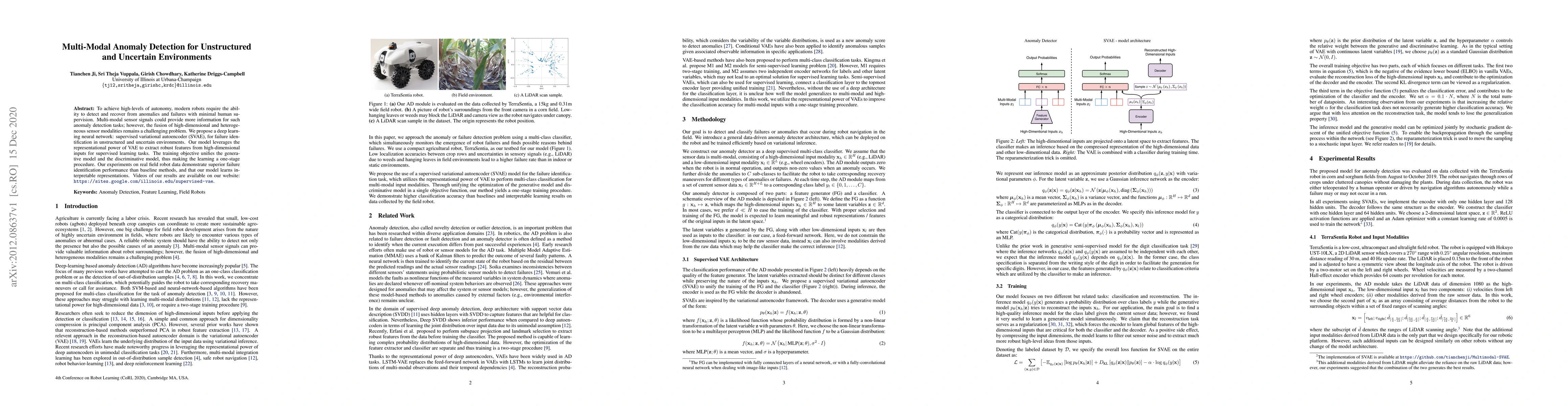 This paper proposes a supervised variational autoencoder (SVAE) for multi-modal anomaly detection in unstructured environments, leveraging the model's ability to extract robust features from high-dimensional sensor data. Experiments show superior performance in failure identification compared to baseline methods.