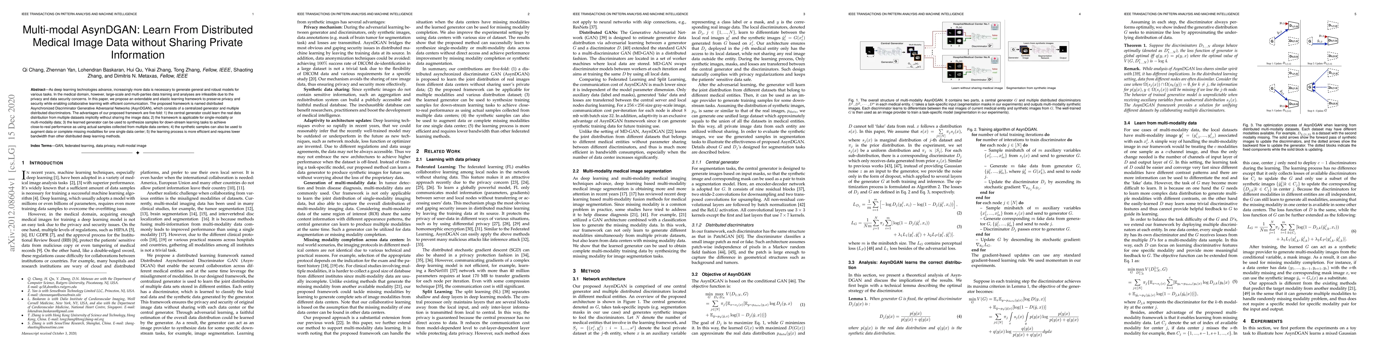 As deep learning technologies advance, increasingly more data is necessary to generate general and robust models for various tasks. In the medical domain, however, large-scale and multi-parties data training and analyses are infeasible due to the privacy and data security concerns. In this paper, we propose an extendable and elastic learning framework to preserve privacy and security while enabling collaborative learning with efficient communication. The proposed framework is named distributed Asynchronized Discriminator Generative Adversarial Networks (AsynDGAN), which consists of a centralized generator and multiple distributed discriminators. The advantages of our proposed framework are five-fold: 1) the central generator could learn the real data distribution from multiple datasets implicitly without sharing the image data; 2) the framework is applicable for single-modality or multi-modality data; 3) the learned generator can be used to synthesize samples for down-stream learning tasks to achieve close-to-real performance as using actual samples collected from multiple data centers; 4) the synthetic samples can also be used to augment data or complete missing modalities for one single data center; 5) the learning process is more efficient and requires lower bandwidth than other distributed deep learning methods.
