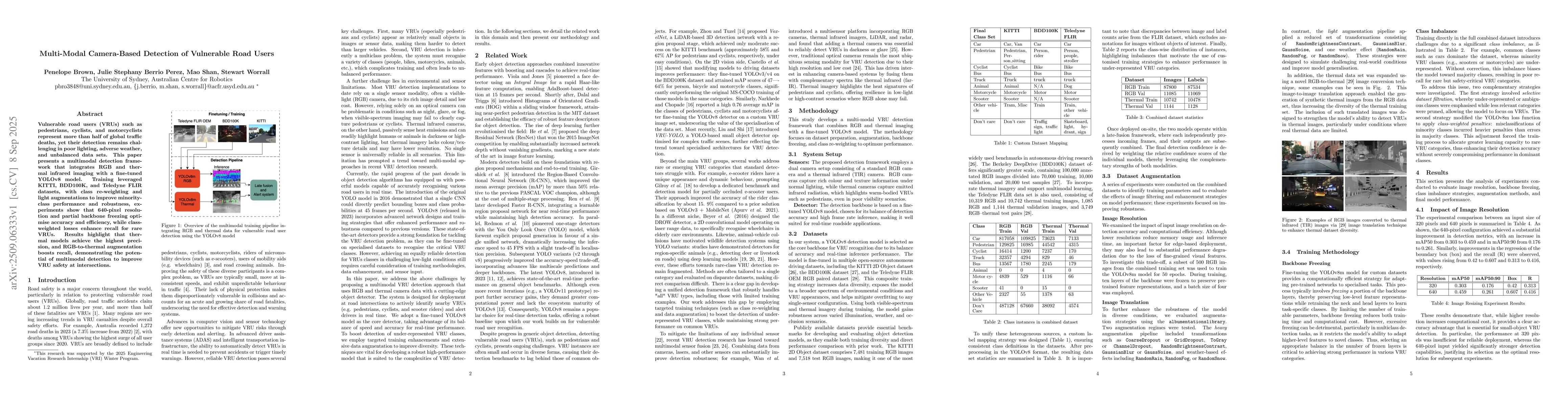 Vulnerable road users (VRUs) such as pedestrians, cyclists, and motorcyclists represent more than half of global traffic deaths, yet their detection remains challenging in poor lighting, adverse weather, and unbalanced data sets. This paper presents a multimodal detection framework that integrates RGB and thermal infrared imaging with a fine-tuned YOLOv8 model. Training leveraged KITTI, BDD100K, and Teledyne FLIR datasets, with class re-weighting and light augmentations to improve minority-class performance and robustness, experiments show that 640-pixel resolution and partial backbone freezing optimise accuracy and efficiency, while class-weighted losses enhance recall for rare VRUs. Results highlight that thermal models achieve the highest precision, and RGB-to-thermal augmentation boosts recall, demonstrating the potential of multimodal detection to improve VRU safety at intersections.