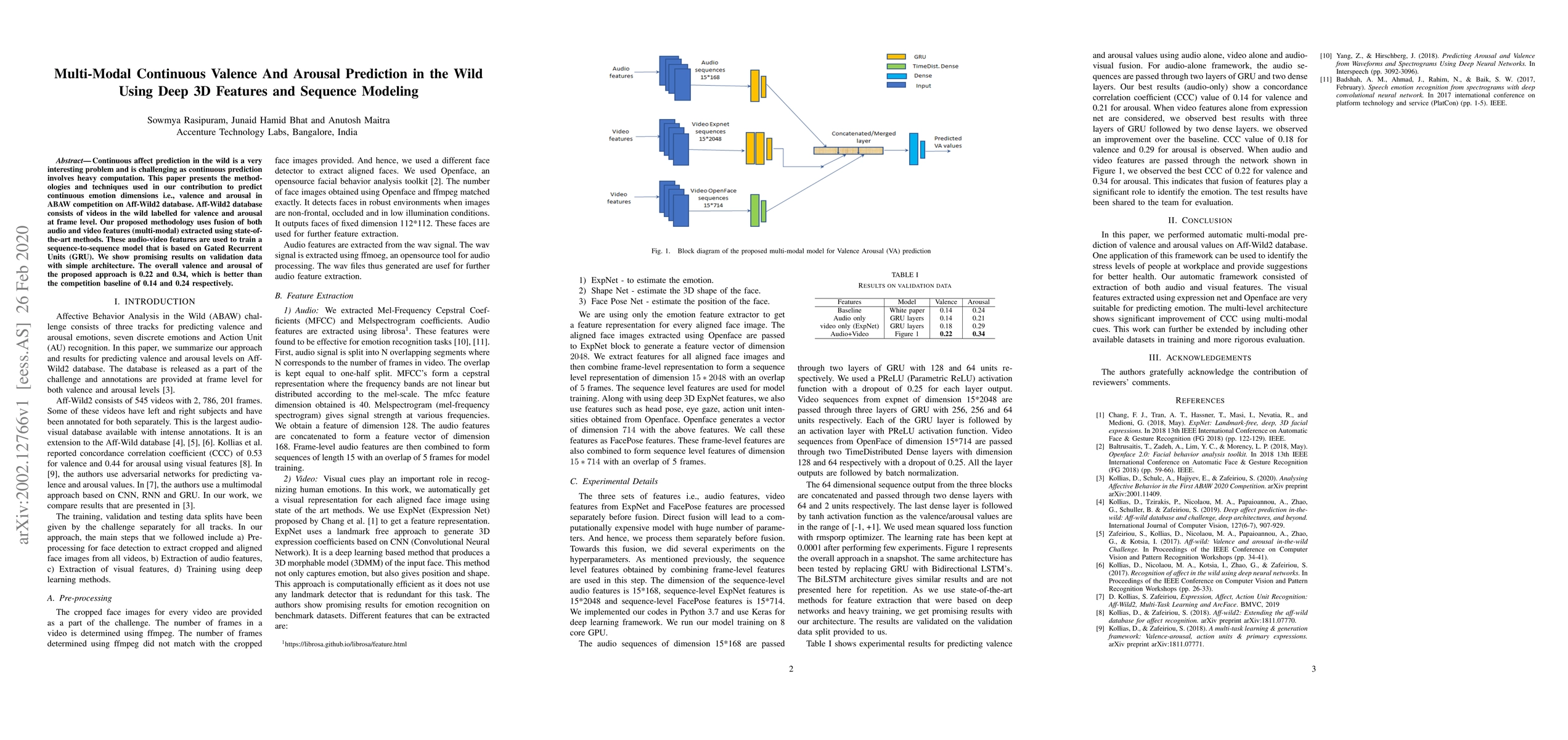 Continuous affect prediction in the wild is a very interesting problem and is challenging as continuous prediction involves heavy computation. This paper presents the methodologies and techniques used in our contribution to predict continuous emotion dimensions i.e., valence and arousal in ABAW competition on Aff-Wild2 database. Aff-Wild2 database consists of videos in the wild labelled for valence and arousal at frame level. Our proposed methodology uses fusion of both audio and video features (multi-modal) extracted using state-of-the-art methods. These audio-video features are used to train a sequence-to-sequence model that is based on Gated Recurrent Units (GRU). We show promising results on validation data with simple architecture. The overall valence and arousal of the proposed approach is 0.22 and 0.34, which is better than the competition baseline of 0.14 and 0.24 respectively.