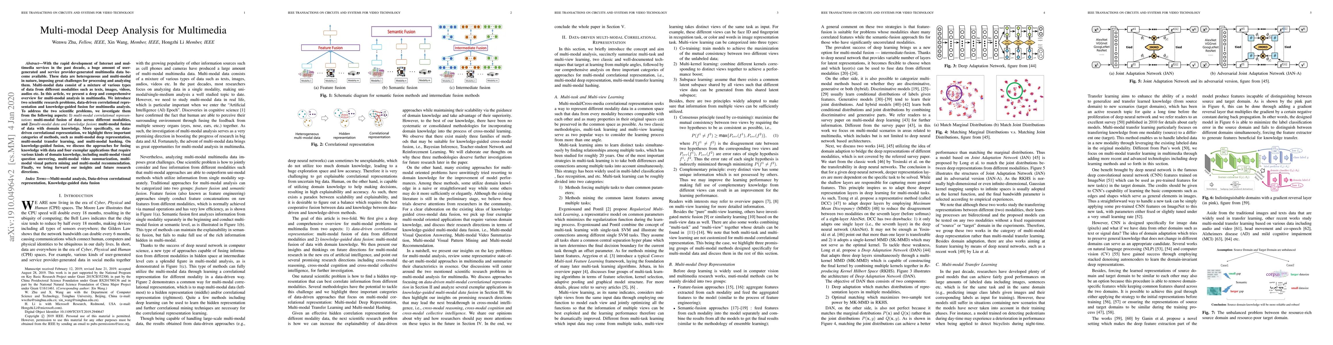 This paper provides a comprehensive overview of multi-modal analysis in multimedia, focusing on data-driven correlational representation and knowledge-guided fusion. It discusses methods like multi-modal deep representation, transfer learning, and hashing, and explores applications such as visual question answering and video summarization.