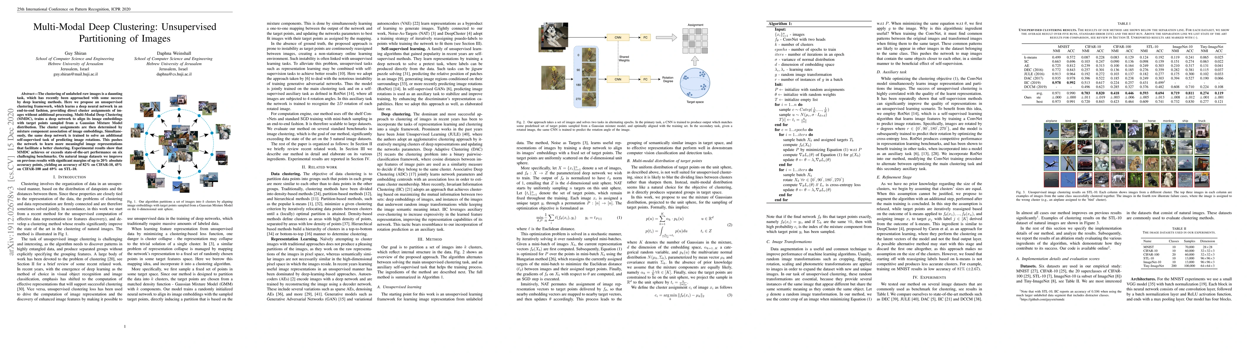 The clustering of unlabeled raw images is a daunting task, which has recently been approached with some success by deep learning methods. Here we propose an unsupervised clustering framework, which learns a deep neural network in an end-to-end fashion, providing direct cluster assignments of images without additional processing. Multi-Modal Deep Clustering (MMDC), trains a deep network to align its image embeddings with target points sampled from a Gaussian Mixture Model distribution. The cluster assignments are then determined by mixture component association of image embeddings. Simultaneously, the same deep network is trained to solve an additional self-supervised task of predicting image rotations. This pushes the network to learn more meaningful image representations that facilitate a better clustering. Experimental results show that MMDC achieves or exceeds state-of-the-art performance on six challenging benchmarks. On natural image datasets we improve on previous results with significant margins of up to 20% absolute accuracy points, yielding an accuracy of 82% on CIFAR-10, 45% on CIFAR-100 and 69% on STL-10.