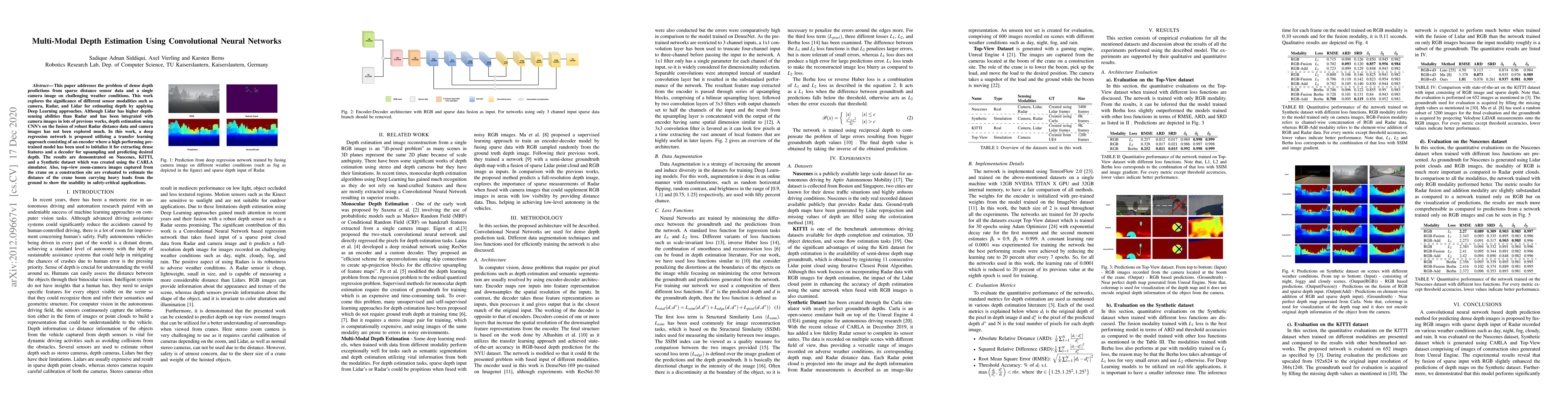 This paper proposes a deep learning approach for multi-modal depth estimation using convolutional neural networks, combining camera images with Radar data to improve accuracy in challenging weather conditions.