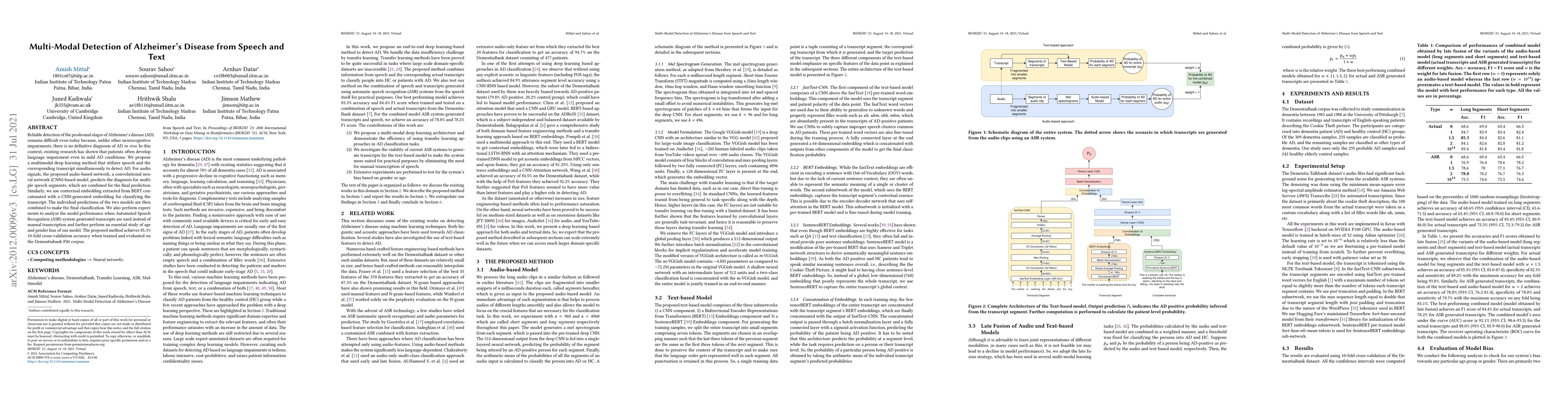 This paper proposes a multimodal deep learning approach to detect Alzheimer's disease using both speech and text data. It combines a CNN-based model for audio signals and a BERT-CNN model for text, achieving 85.3% accuracy in detecting AD from speech and corresponding transcripts.