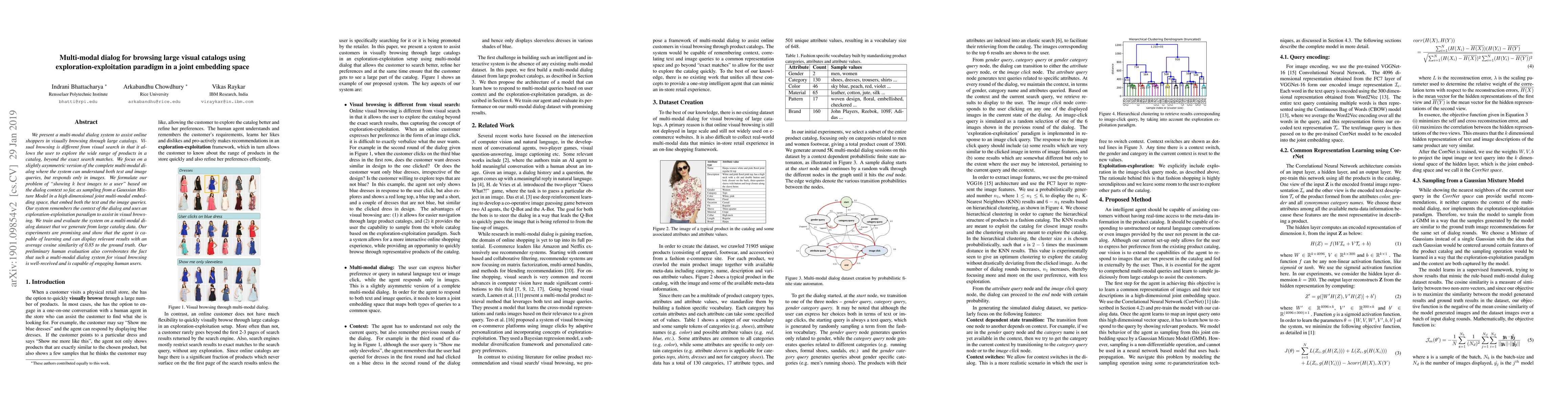 This paper introduces a multi-modal dialog system for visually browsing large product catalogs, employing an exploration-exploitation paradigm in a joint embedding space. The system effectively shows relevant images in response to text and image queries, achieving an average cosine similarity of 0.85 to ground truth and receiving positive preliminary human evaluation.