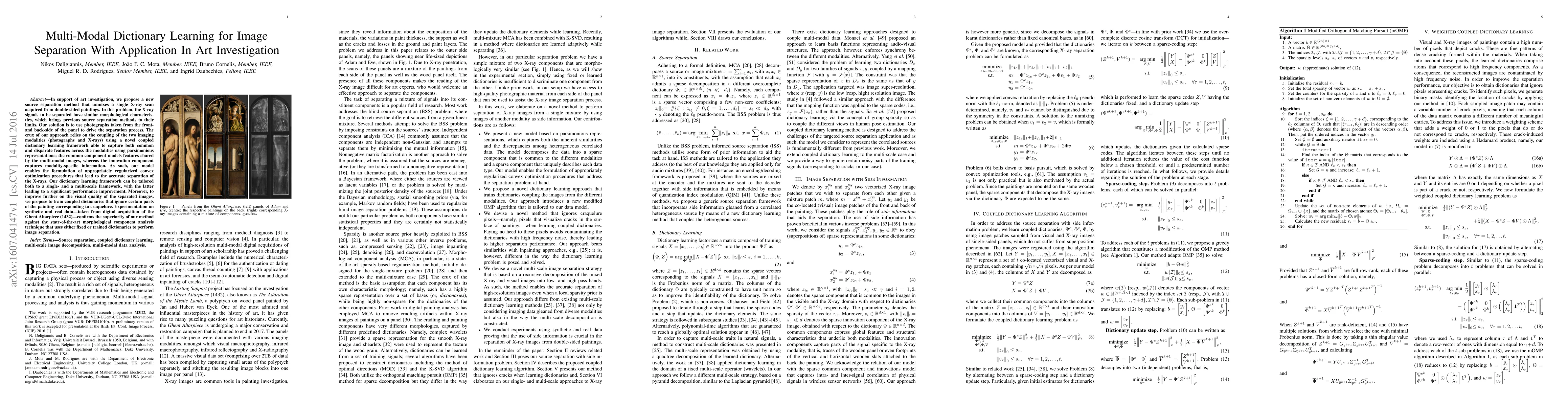 In support of art investigation, we propose a new source separation method that unmixes a single X-ray scan acquired from double-sided paintings. In this problem, the X-ray signals to be separated have similar morphological characteristics, which brings previous source separation methods to their limits. Our solution is to use photographs taken from the front and back-side of the panel to drive the separation process. The crux of our approach relies on the coupling of the two imaging modalities (photographs and X-rays) using a novel coupled dictionary learning framework able to capture both common and disparate features across the modalities using parsimonious representations; the common component models features shared by the multi-modal images, whereas the innovation component captures modality-specific information. As such, our model enables the formulation of appropriately regularized convex optimization procedures that lead to the accurate separation of the X-rays. Our dictionary learning framework can be tailored both to a single- and a multi-scale framework, with the latter leading to a significant performance improvement. Moreover, to improve further on the visual quality of the separated images, we propose to train coupled dictionaries that ignore certain parts of the painting corresponding to craquelure. Experimentation on synthetic and real data - taken from digital acquisition of the Ghent Altarpiece (1432) - confirms the superiority of our method against the state-of-the-art morphological component analysis technique that uses either fixed or trained dictionaries to perform image separation.