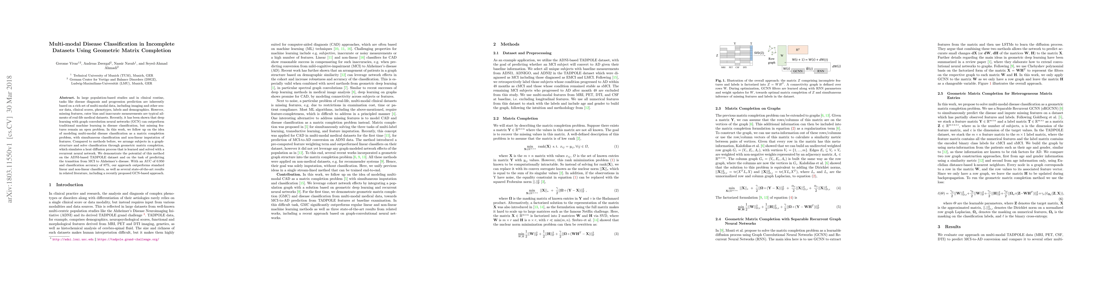 This paper proposes a novel method for multi-modal disease classification in incomplete datasets using geometric matrix completion and graph convolutional neural networks. The approach outperforms traditional and state-of-the-art methods, achieving an AUC of 0.950 and 87% classification accuracy in predicting Alzheimer's disease progression.