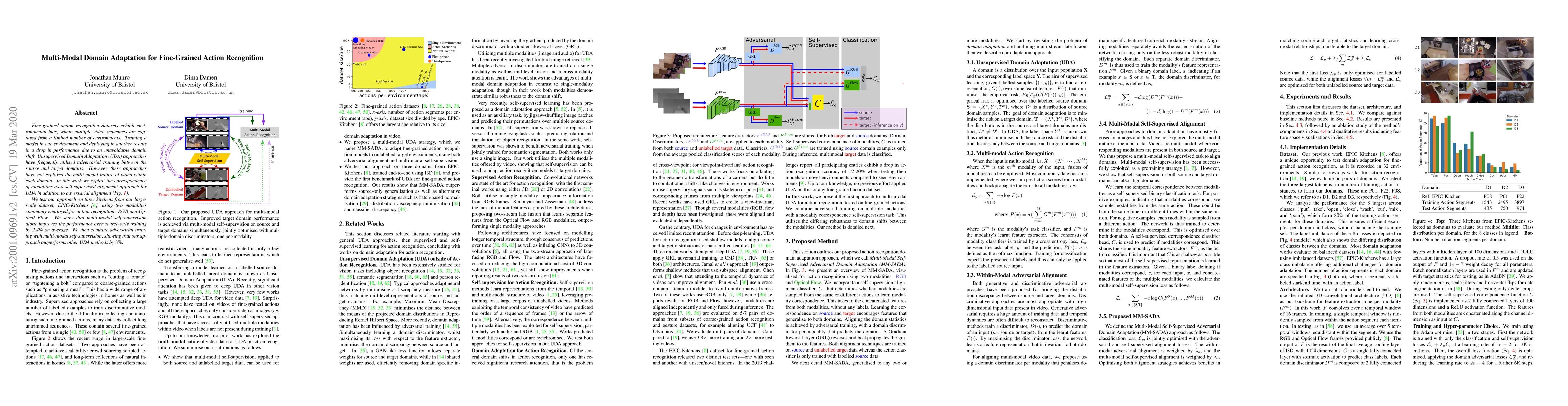 This paper proposes a multi-modal domain adaptation method for fine-grained action recognition, leveraging both self-supervised alignment and adversarial training to mitigate domain shifts. Experiments on EPIC-Kitchens dataset demonstrate a 2.4% average improvement over source-only training with multi-modal self-supervision and a 3% improvement with the combined approach.