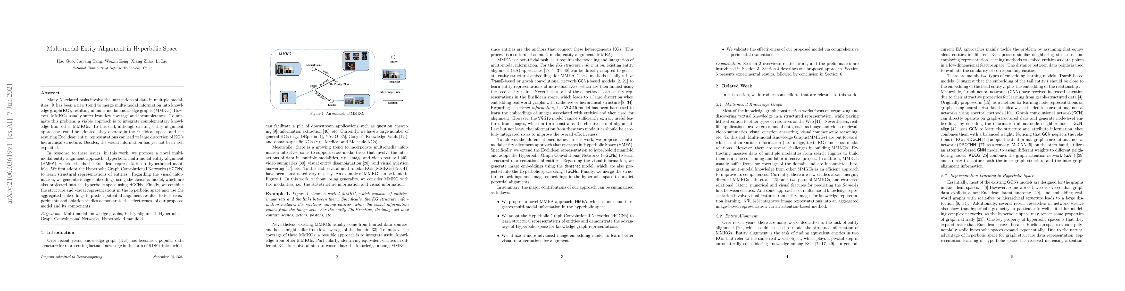 The paper proposes Hyperbolic multi-modal entity alignment (HMEA) to integrate multi-modal knowledge graphs by aligning entities in hyperbolic space, leveraging Hyperbolic Graph Convolutional Networks (HGCNs) for structural and visual embeddings, and demonstrating improved performance over Euclidean methods.