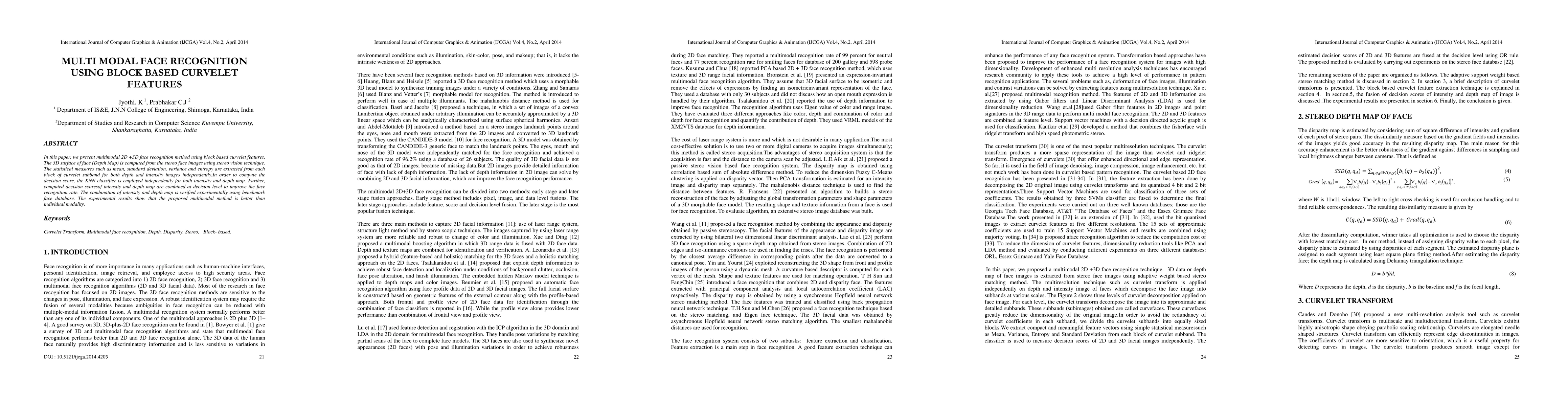 A multimodal face recognition method combines 2D intensity images with 3D depth maps using block-based curvelet features to improve accuracy. Experimental results show that the proposed method outperforms individual modalities.