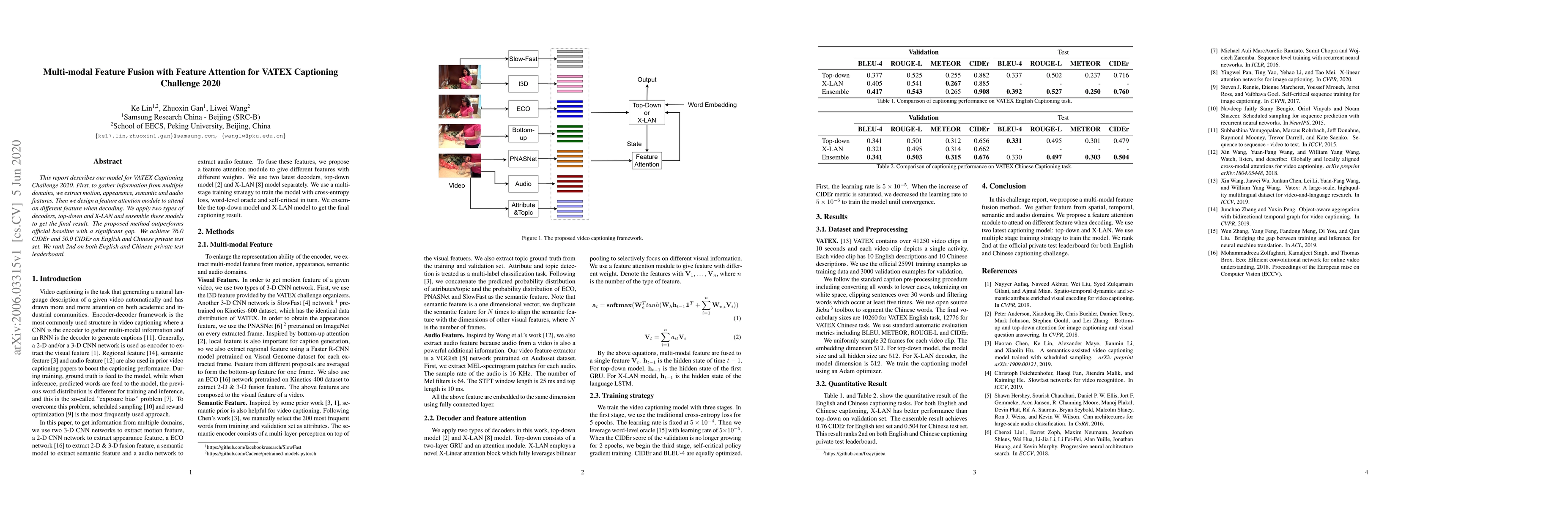This report describes our model for VATEX Captioning Challenge 2020. First, to gather information from multiple domains, we extract motion, appearance, semantic and audio features. Then we design a feature attention module to attend on different feature when decoding. We apply two types of decoders, top-down and X-LAN and ensemble these models to get the final result. The proposed method outperforms official baseline with a significant gap. We achieve 76.0 CIDEr and 50.0 CIDEr on English and Chinese private test set. We rank 2nd on both English and Chinese private test leaderboard.