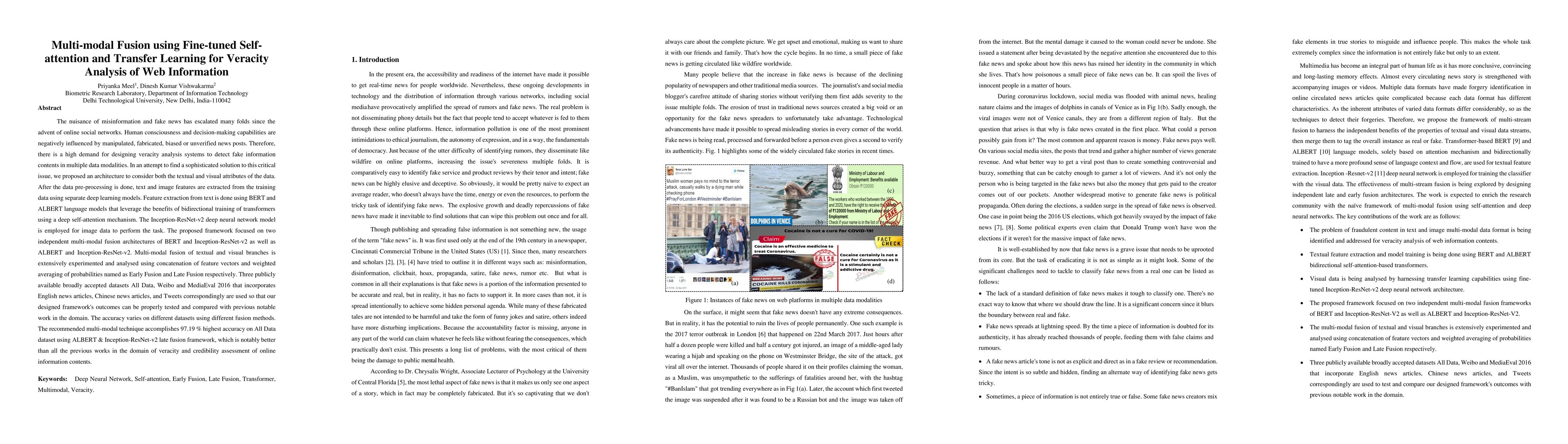 The nuisance of misinformation and fake news has escalated many folds since the advent of online social networks. Human consciousness and decision-making capabilities are negatively influenced by manipulated, fabricated, biased or unverified news posts. Therefore, there is a high demand for designing veracity analysis systems to detect fake information contents in multiple data modalities. In an attempt to find a sophisticated solution to this critical issue, we proposed an architecture to consider both the textual and visual attributes of the data. After the data pre-processing is done, text and image features are extracted from the training data using separate deep learning models. Feature extraction from text is done using BERT and ALBERT language models that leverage the benefits of bidirectional training of transformers using a deep self-attention mechanism. The Inception-ResNet-v2 deep neural network model is employed for image data to perform the task. The proposed framework focused on two independent multi-modal fusion architectures of BERT and Inception-ResNet-v2 as well as ALBERT and Inception-ResNet-v2. Multi-modal fusion of textual and visual branches is extensively experimented and analysed using concatenation of feature vectors and weighted averaging of probabilities named as Early Fusion and Late Fusion respectively. Three publicly available broadly accepted datasets All Data, Weibo and MediaEval 2016 that incorporates English news articles, Chinese news articles, and Tweets correspondingly are used so that our designed framework's outcomes can be properly tested and compared with previous notable work in the domain.