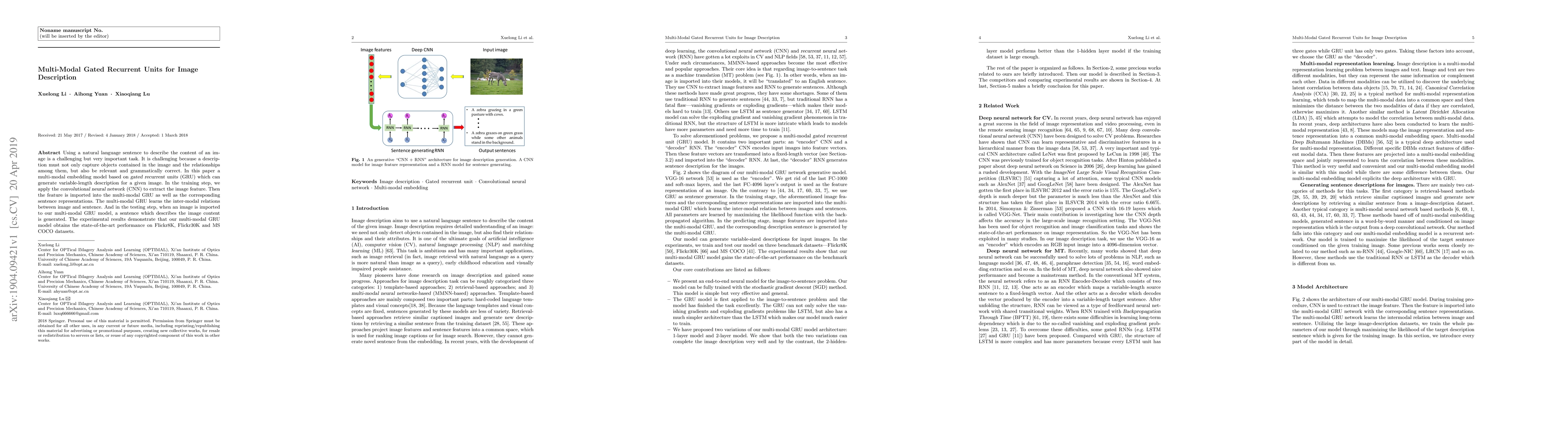 This research paper proposes a multi-modal gated recurrent unit (GRU) model for generating descriptive sentences from images. The model combines CNNs for image feature extraction and GRUs for learning inter-modal relations between images and sentences, achieving state-of-the-art performance on several benchmark datasets. For more details, refer directly to the original publication.