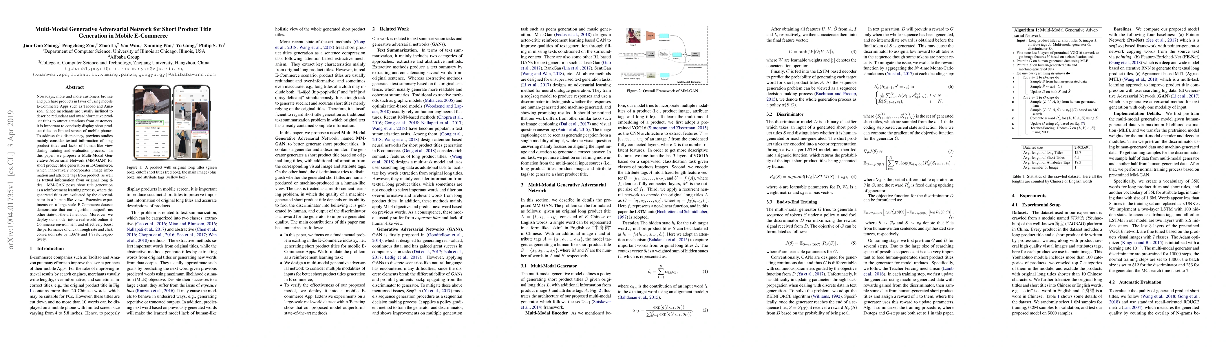 This paper proposes a Multi-Modal Generative Adversarial Network (MM-GAN) to generate concise short product titles for mobile E-Commerce, incorporating image, attribute tags, and textual information. The model outperforms existing methods and boosts click-through and conversion rates by 1.66% and 1.87% respectively.