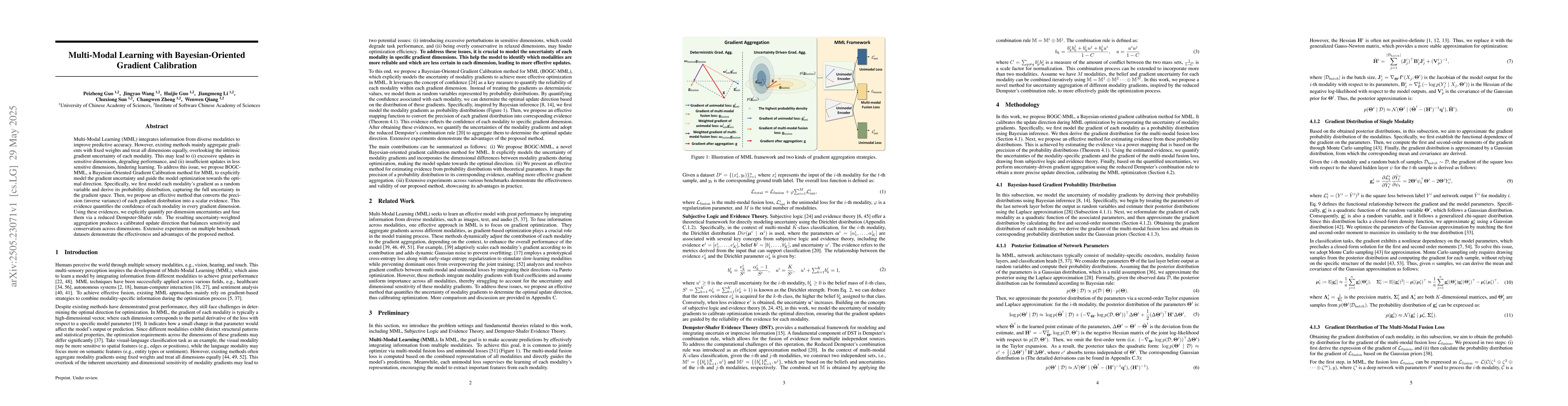 The research proposes BOGC-MML, a Bayesian-Oriented Gradient Calibration method for Multi-Modal Learning (MML). It models each modality's gradient as a random variable, derives its probability distribution, and converts the precision of each gradient distribution into scalar evidence to quantify confidence in each modality's gradient dimensions. Uncertainty-weighted aggregation is then used to produce a calibrated update direction.