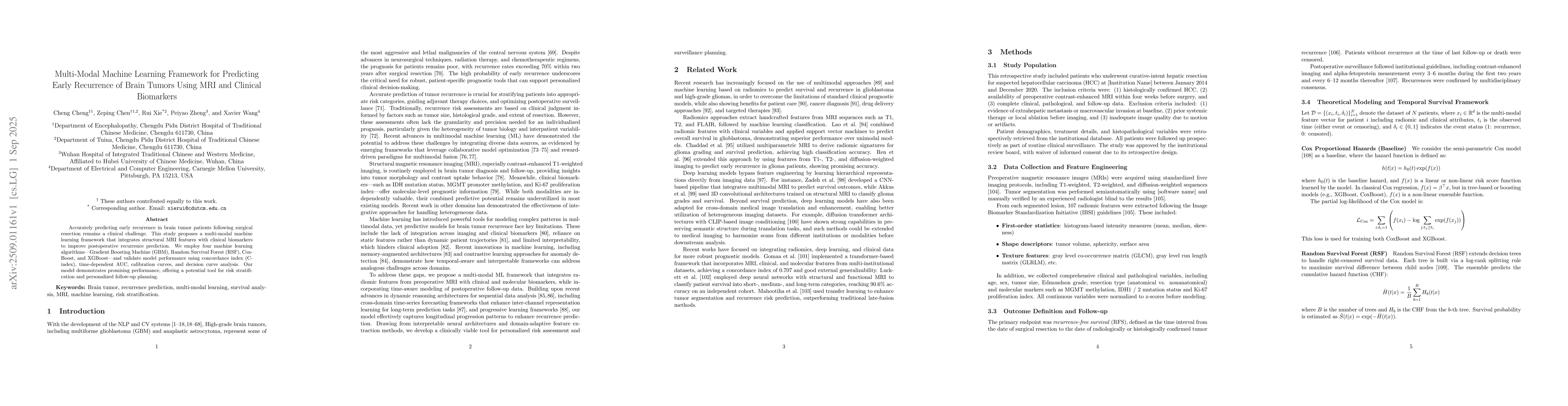 Accurately predicting early recurrence in brain tumor patients following surgical resection remains a clinical challenge. This study proposes a multi-modal machine learning framework that integrates structural MRI features with clinical biomarkers to improve postoperative recurrence prediction. We employ four machine learning algorithms -- Gradient Boosting Machine (GBM), Random Survival Forest (RSF), CoxBoost, and XGBoost -- and validate model performance using concordance index (C-index), time-dependent AUC, calibration curves, and decision curve analysis. Our model demonstrates promising performance, offering a potential tool for risk stratification and personalized follow-up planning.
