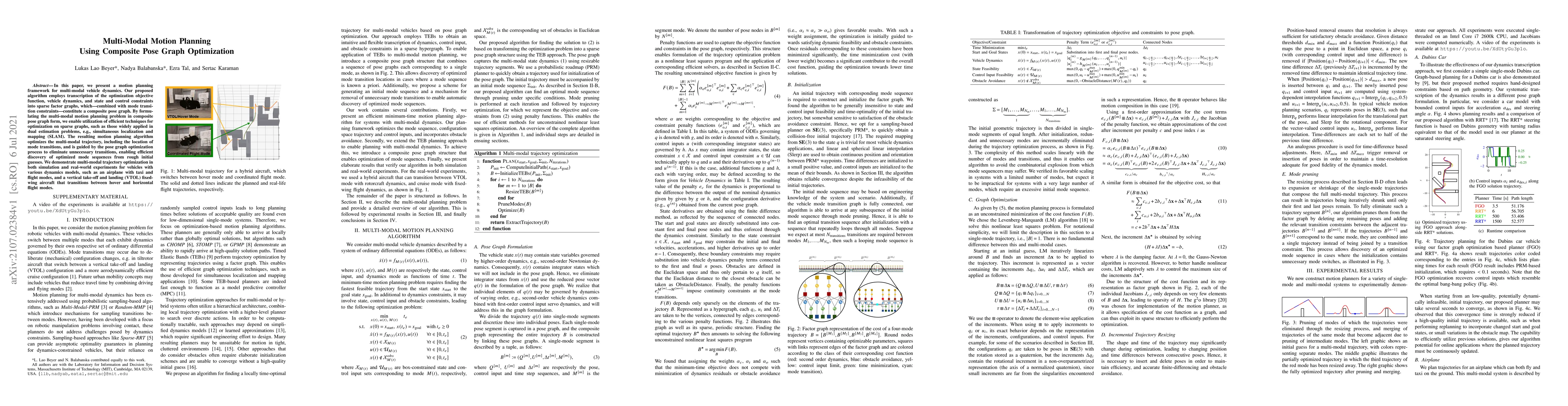 This paper introduces a motion planning framework for multi-modal vehicles using composite pose graph optimization, which leverages sparse factor graphs to optimize trajectories and mode transitions efficiently. The method is demonstrated through simulations and real-world tests on vehicles with different dynamic modes.