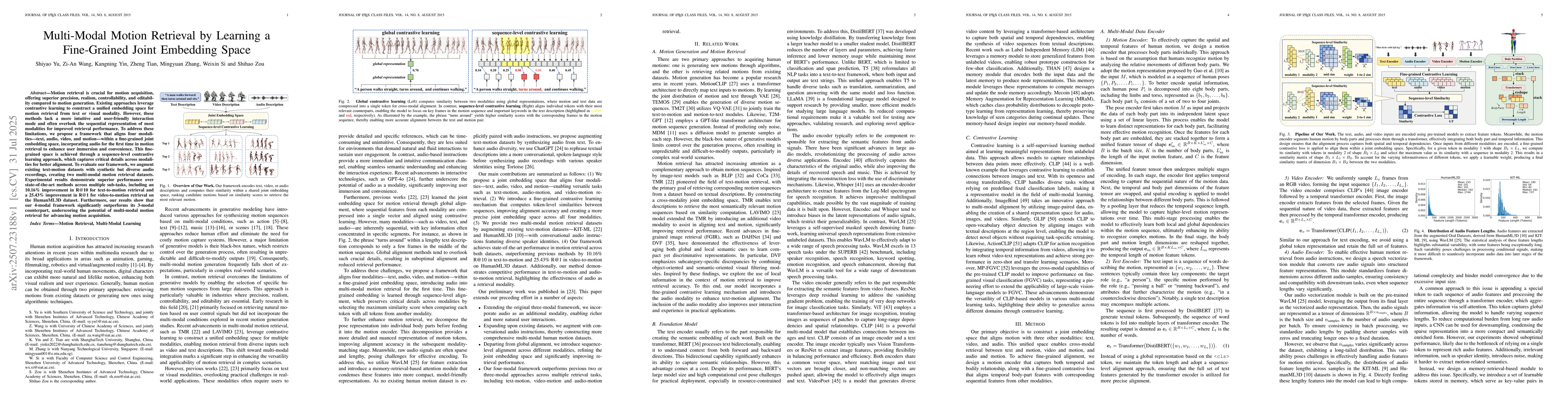 Motion retrieval is crucial for motion acquisition, offering superior precision, realism, controllability, and editability compared to motion generation. Existing approaches leverage contrastive learning to construct a unified embedding space for motion retrieval from text or visual modality. However, these methods lack a more intuitive and user-friendly interaction mode and often overlook the sequential representation of most modalities for improved retrieval performance. To address these limitations, we propose a framework that aligns four modalities -- text, audio, video, and motion -- within a fine-grained joint embedding space, incorporating audio for the first time in motion retrieval to enhance user immersion and convenience. This fine-grained space is achieved through a sequence-level contrastive learning approach, which captures critical details across modalities for better alignment. To evaluate our framework, we augment existing text-motion datasets with synthetic but diverse audio recordings, creating two multi-modal motion retrieval datasets. Experimental results demonstrate superior performance over state-of-the-art methods across multiple sub-tasks, including an 10.16% improvement in R@10 for text-to-motion retrieval and a 25.43% improvement in R@1 for video-to-motion retrieval on the HumanML3D dataset. Furthermore, our results show that our 4-modal framework significantly outperforms its 3-modal counterpart, underscoring the potential of multi-modal motion retrieval for advancing motion acquisition.