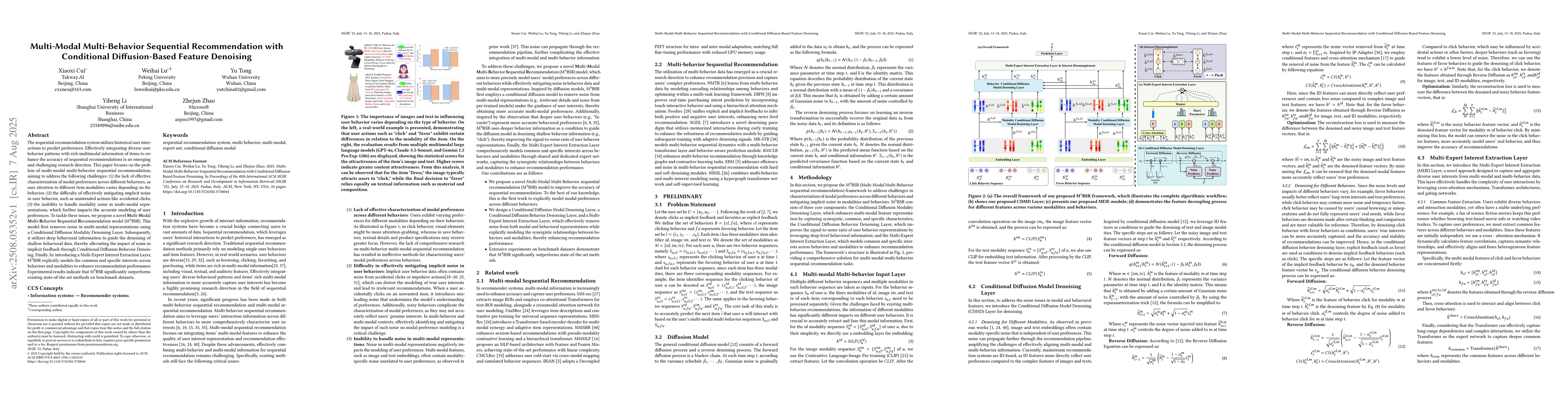 The sequential recommendation system utilizes historical user interactions to predict preferences. Effectively integrating diverse user behavior patterns with rich multimodal information of items to enhance the accuracy of sequential recommendations is an emerging and challenging research direction. This paper focuses on the problem of multi-modal multi-behavior sequential recommendation, aiming to address the following challenges: (1) the lack of effective characterization of modal preferences across different behaviors, as user attention to different item modalities varies depending on the behavior; (2) the difficulty of effectively mitigating implicit noise in user behavior, such as unintended actions like accidental clicks; (3) the inability to handle modality noise in multi-modal representations, which further impacts the accurate modeling of user preferences. To tackle these issues, we propose a novel Multi-Modal Multi-Behavior Sequential Recommendation model (M$^3$BSR). This model first removes noise in multi-modal representations using a Conditional Diffusion Modality Denoising Layer. Subsequently, it utilizes deep behavioral information to guide the denoising of shallow behavioral data, thereby alleviating the impact of noise in implicit feedback through Conditional Diffusion Behavior Denoising. Finally, by introducing a Multi-Expert Interest Extraction Layer, M$^3$BSR explicitly models the common and specific interests across behaviors and modalities to enhance recommendation performance. Experimental results indicate that M$^3$BSR significantly outperforms existing state-of-the-art methods on benchmark datasets.