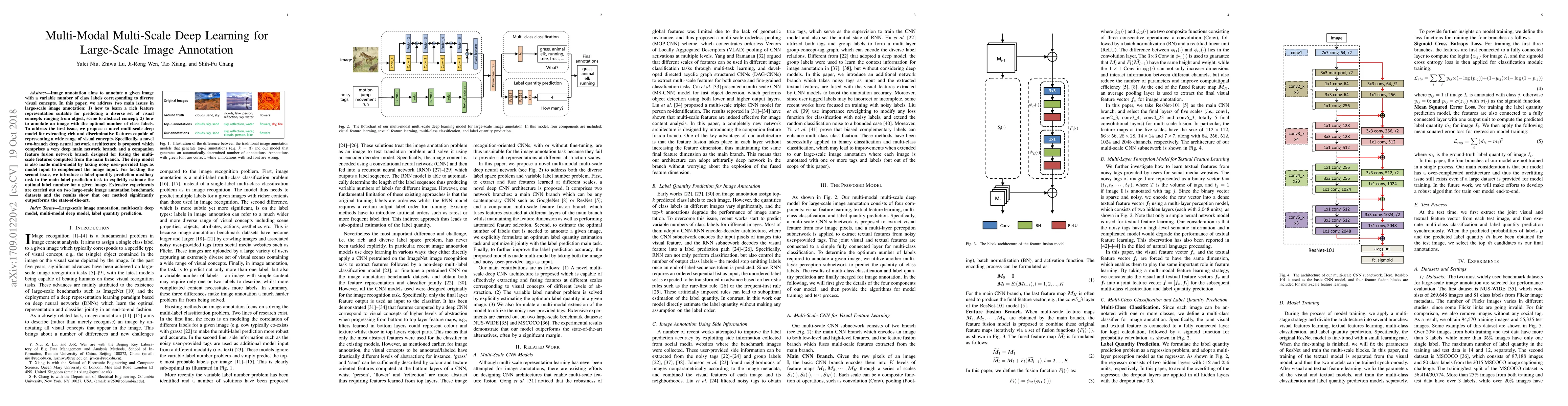 This paper proposes a multi-modal multi-scale deep learning model for large-scale image annotation, addressing the challenges of rich feature representation and optimal label quantity prediction. The model uses a two-branch architecture for feature extraction and fusion, and incorporates noisy user tags to enhance representation, while an auxiliary task predicts the optimal number of labels for each image.
