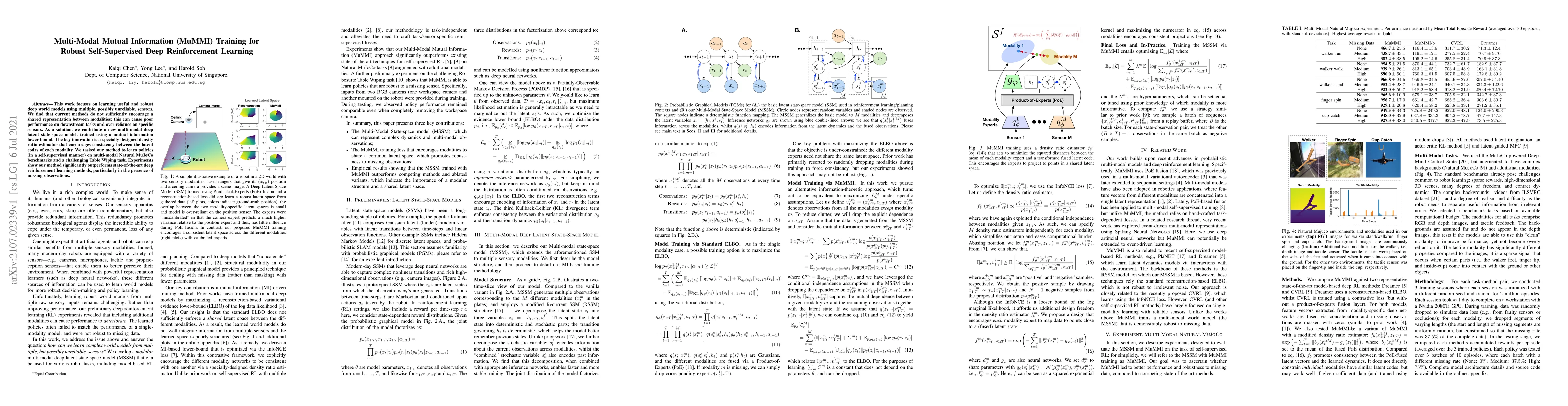 This paper introduces a novel multi-modal mutual information training method called MuMMI to enhance robust self-supervised deep reinforcement learning using multiple sensors. The method significantly outperforms existing techniques, especially when observations are incomplete, by encouraging consistency between latent codes across modalities.
