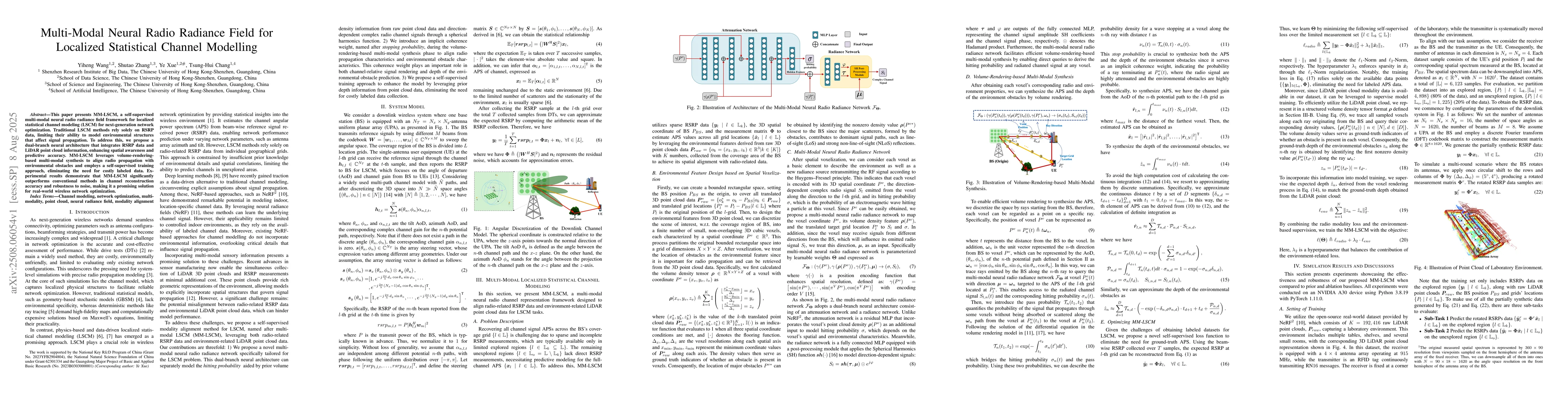 This paper presents MM-LSCM, a self-supervised multi-modal neural radio radiance field framework for localized statistical channel modeling (LSCM) for next-generation network optimization. Traditional LSCM methods rely solely on RSRP data, limiting their ability to model environmental structures that affect signal propagation. To address this, we propose a dual-branch neural architecture that integrates RSRP data and LiDAR point cloud information, enhancing spatial awareness and predictive accuracy. MM-LSCM leverages volume-rendering-based multi-modal synthesis to align radio propagation with environmental obstacles and employs a self-supervised training approach, eliminating the need for costly labeled data. Experimental results demonstrate that MM-LSCM significantly outperforms conventional methods in channel reconstruction accuracy and robustness to noise, making it a promising solution for real-world wireless network optimization.