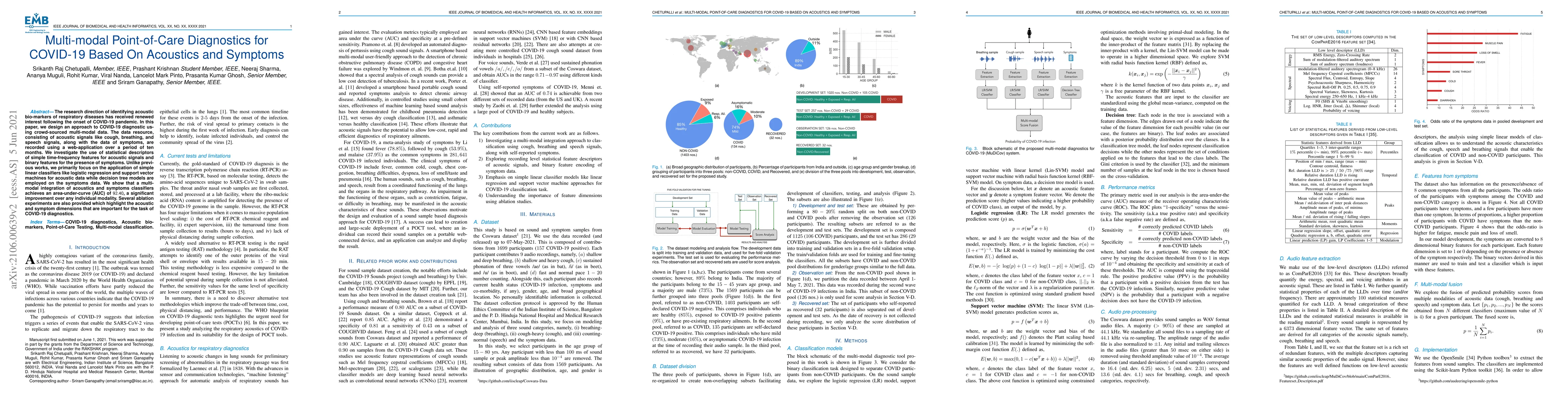This paper develops a multi-modal point-of-care diagnostic tool for COVID-19 using crowd-sourced acoustic and symptom data. It employs simple linear classifiers for acoustic signals and decision tree models for symptom data, achieving an AUC of 92.40 through their integration.