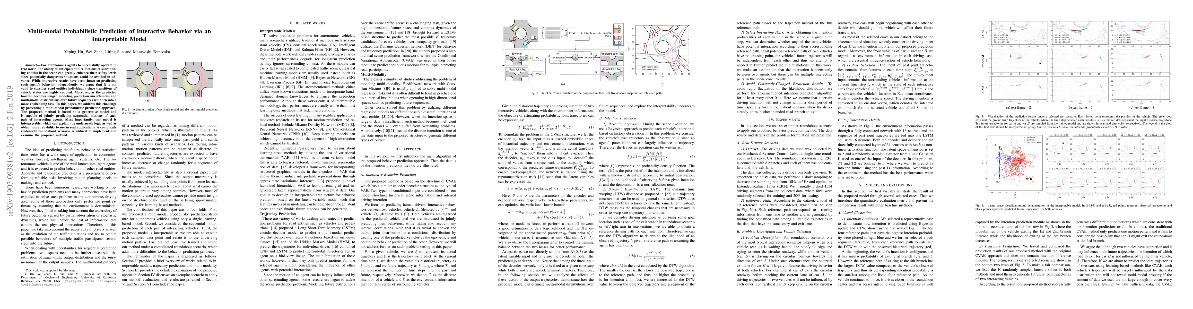 For autonomous agents to successfully operate in real world, the ability to anticipate future motions of surrounding entities in the scene can greatly enhance their safety levels since potentially dangerous situations could be avoided in advance. While impressive results have been shown on predicting each agent's behavior independently, we argue that it is not valid to consider road entities individually since transitions of vehicle states are highly coupled. Moreover, as the predicted horizon becomes longer, modeling prediction uncertainties and multi-modal distributions over future sequences will turn into a more challenging task. In this paper, we address this challenge by presenting a multi-modal probabilistic prediction approach. The proposed method is based on a generative model and is capable of jointly predicting sequential motions of each pair of interacting agents. Most importantly, our model is interpretable, which can explain the underneath logic as well as obtain more reliability to use in real applications. A complicate real-world roundabout scenario is utilized to implement and examine the proposed method.