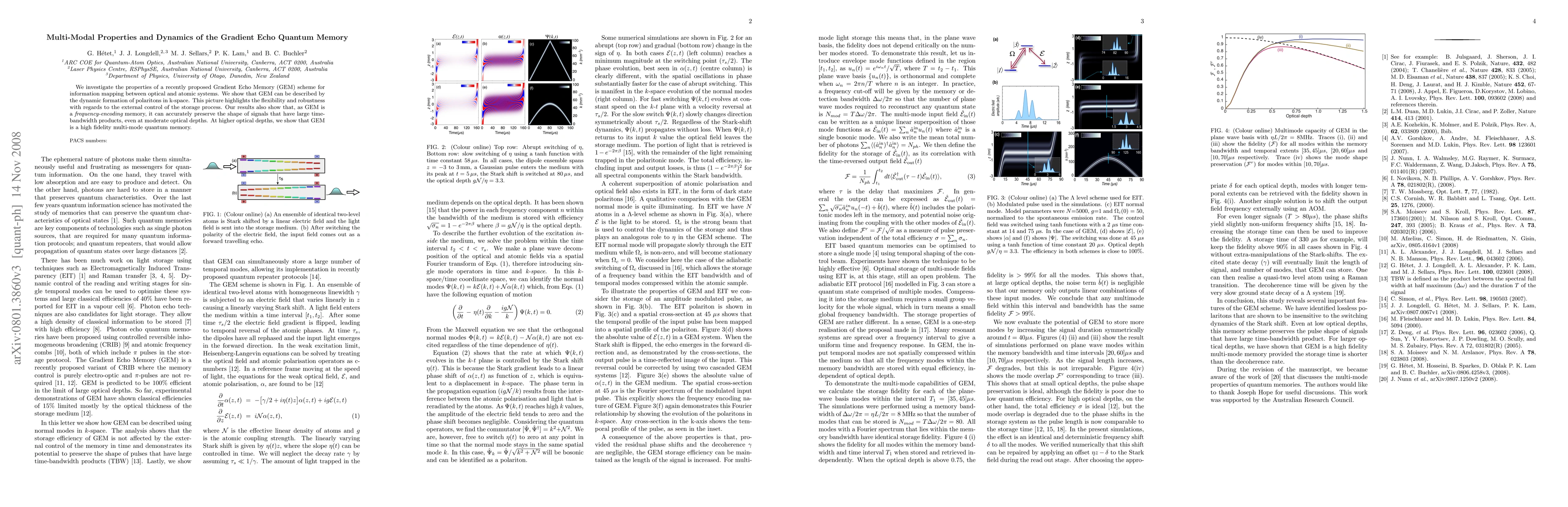 The Gradient Echo Memory (GEM) scheme effectively maps information between optical and atomic systems through dynamic polariton formation, demonstrating flexibility and robustness under external control. GEM preserves signal shapes with large time-bandwidth products, showcasing high fidelity as a multi-mode quantum memory at higher optical depths.