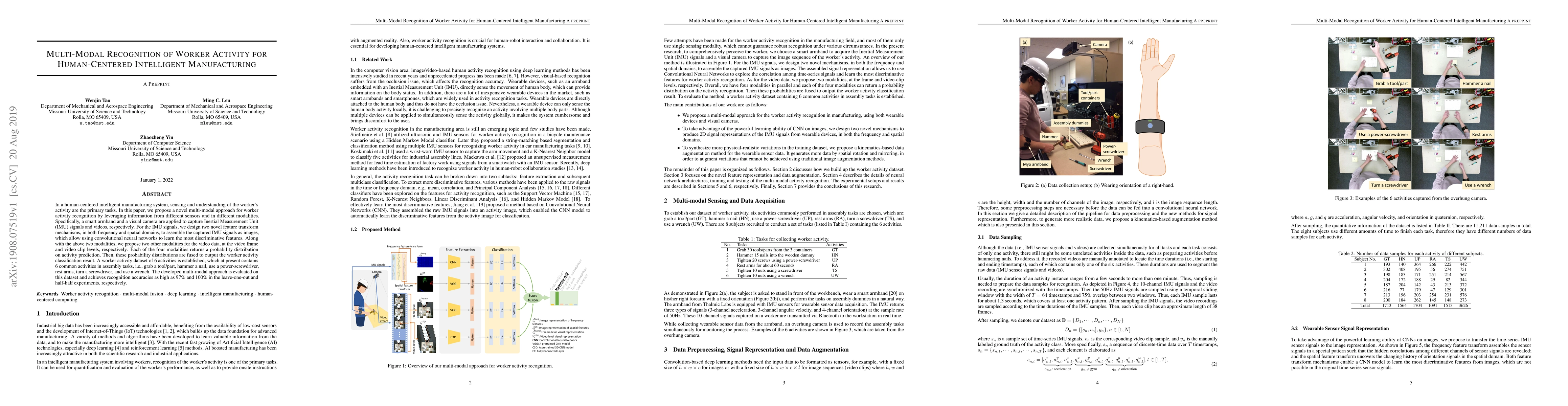 This paper proposes a multi-modal approach for recognizing worker activities in human-centered intelligent manufacturing, using a smart armband and a visual camera to capture IMU signals and videos. The IMU signals are transformed into images for convolutional neural networks, while video data is analyzed at frame and clip levels, and all modalities are fused to classify activities with high accuracy.