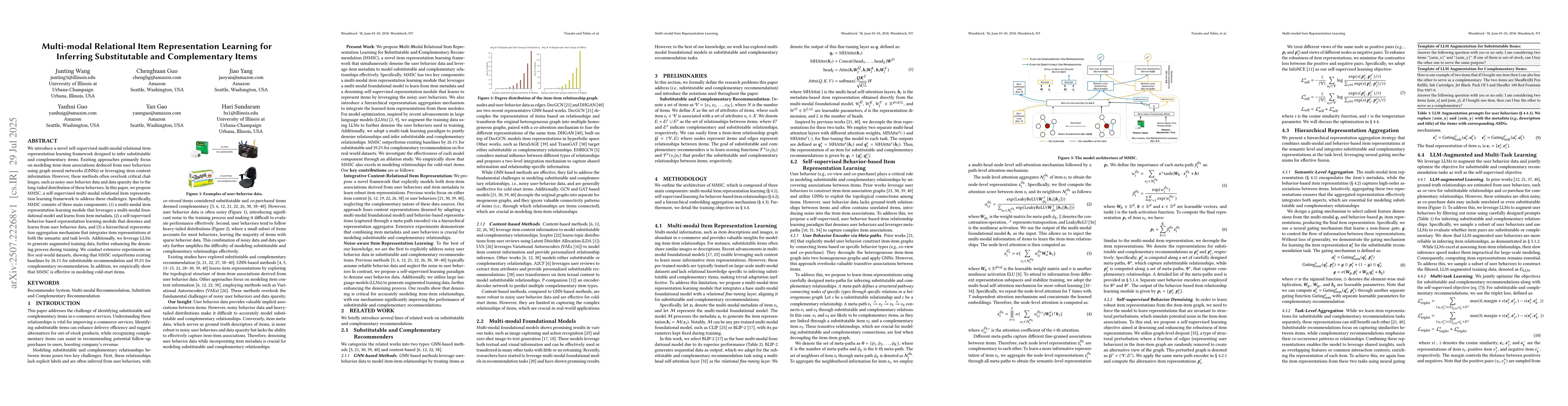 We introduce a novel self-supervised multi-modal relational item representation learning framework designed to infer substitutable and complementary items. Existing approaches primarily focus on modeling item-item associations deduced from user behaviors using graph neural networks (GNNs) or leveraging item content information. However, these methods often overlook critical challenges, such as noisy user behavior data and data sparsity due to the long-tailed distribution of these behaviors. In this paper, we propose MMSC, a self-supervised multi-modal relational item representation learning framework to address these challenges. Specifically, MMSC consists of three main components: (1) a multi-modal item representation learning module that leverages a multi-modal foundational model and learns from item metadata, (2) a self-supervised behavior-based representation learning module that denoises and learns from user behavior data, and (3) a hierarchical representation aggregation mechanism that integrates item representations at both the semantic and task levels. Additionally, we leverage LLMs to generate augmented training data, further enhancing the denoising process during training. We conduct extensive experiments on five real-world datasets, showing that MMSC outperforms existing baselines by 26.1% for substitutable recommendation and 39.2% for complementary recommendation. In addition, we empirically show that MMSC is effective in modeling cold-start items.