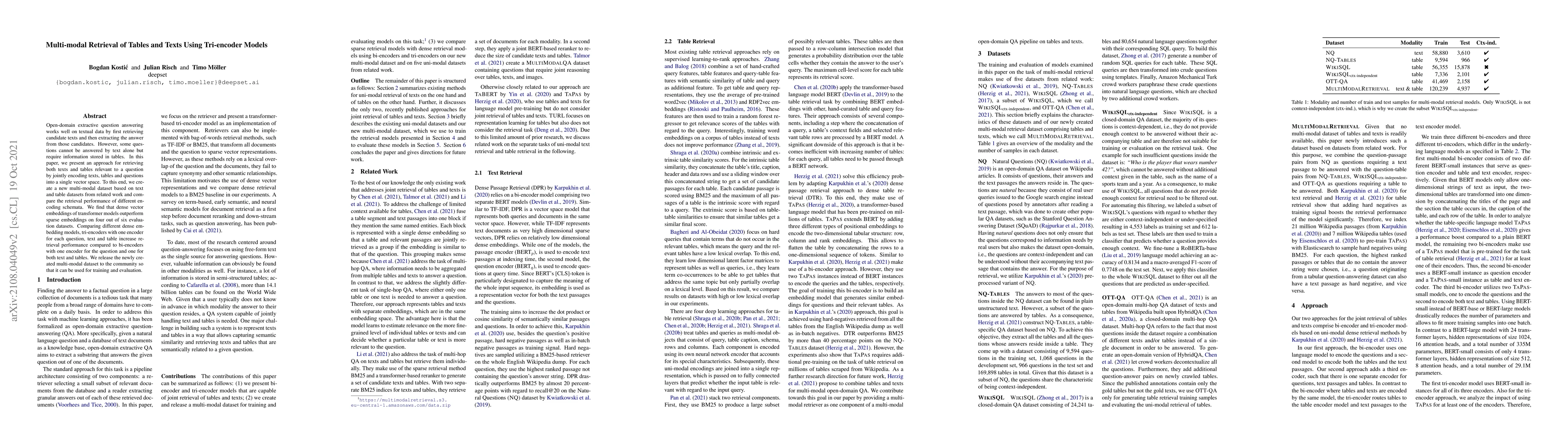 Open-domain extractive question answering works well on textual data by first retrieving candidate texts and then extracting the answer from those candidates. However, some questions cannot be answered by text alone but require information stored in tables. In this paper, we present an approach for retrieving both texts and tables relevant to a question by jointly encoding texts, tables and questions into a single vector space. To this end, we create a new multi-modal dataset based on text and table datasets from related work and compare the retrieval performance of different encoding schemata. We find that dense vector embeddings of transformer models outperform sparse embeddings on four out of six evaluation datasets. Comparing different dense embedding models, tri-encoders with one encoder for each question, text and table, increase retrieval performance compared to bi-encoders with one encoder for the question and one for both text and tables. We release the newly created multi-modal dataset to the community so that it can be used for training and evaluation.
