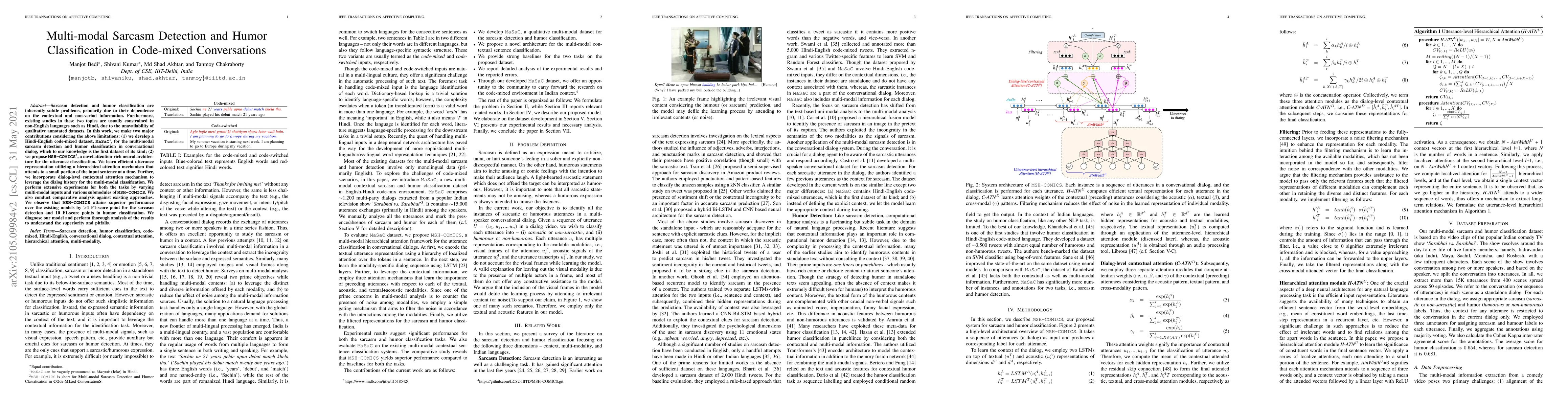 This paper introduces MaSaC, the first dataset for multi-modal sarcasm detection and humor classification in Hindi-English code-mixed conversations, and proposes MSH-COMICS, an attention-rich neural architecture that outperforms existing models with improved F1-scores in both tasks.