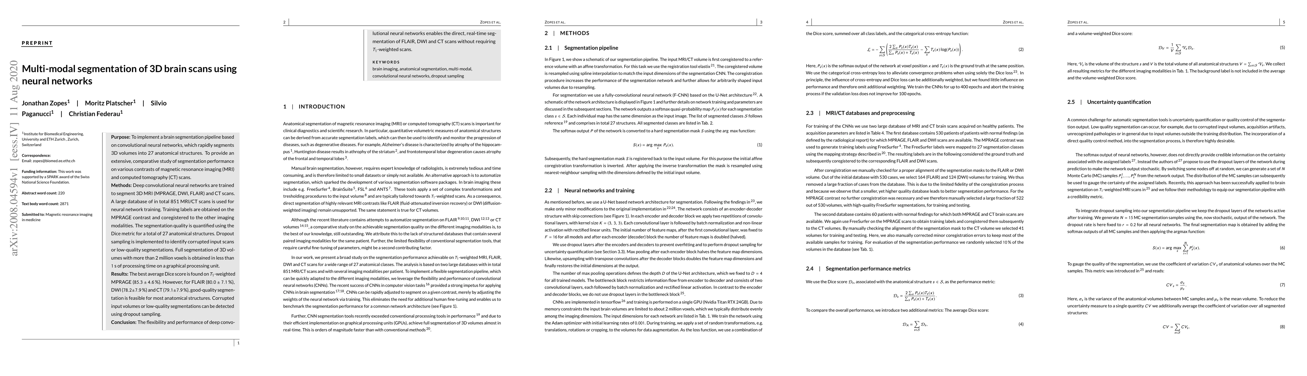Purpose: To implement a brain segmentation pipeline based on convolutional neural networks, which rapidly segments 3D volumes into 27 anatomical structures. To provide an extensive, comparative study of segmentation performance on various contrasts of magnetic resonance imaging (MRI) and computed tomography (CT) scans. Methods: Deep convolutional neural networks are trained to segment 3D MRI (MPRAGE, DWI, FLAIR) and CT scans. A large database of in total 851 MRI/CT scans is used for neural network training. Training labels are obtained on the MPRAGE contrast and coregistered to the other imaging modalities. The segmentation quality is quantified using the Dice metric for a total of 27 anatomical structures. Dropout sampling is implemented to identify corrupted input scans or low-quality segmentations. Full segmentation of 3D volumes with more than 2 million voxels is obtained in less than 1s of processing time on a graphical processing unit. Results: The best average Dice score is found on $T_1$-weighted MPRAGE ($85.3\pm4.6\,\%$). However, for FLAIR ($80.0\pm7.1\,\%$), DWI ($78.2\pm7.9\,\%$) and CT ($79.1\pm 7.9\,\%$), good-quality segmentation is feasible for most anatomical structures. Corrupted input volumes or low-quality segmentations can be detected using dropout sampling. Conclusion: The flexibility and performance of deep convolutional neural networks enables the direct, real-time segmentation of FLAIR, DWI and CT scans without requiring $T_1$-weighted scans.