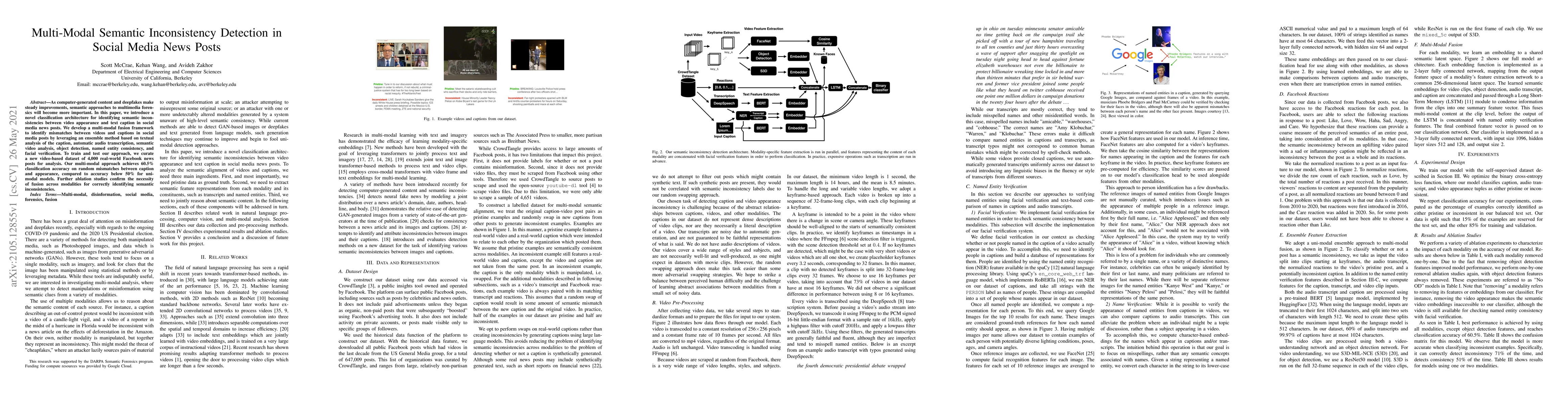This paper proposes a novel multi-modal classification architecture to detect semantic inconsistencies between video and text in social media news posts, leveraging textual analysis, audio transcription, and semantic video analysis. The approach achieves 60.5% accuracy, significantly outperforming uni-modal models, demonstrating the importance of multi-modal fusion for identifying mismatches.