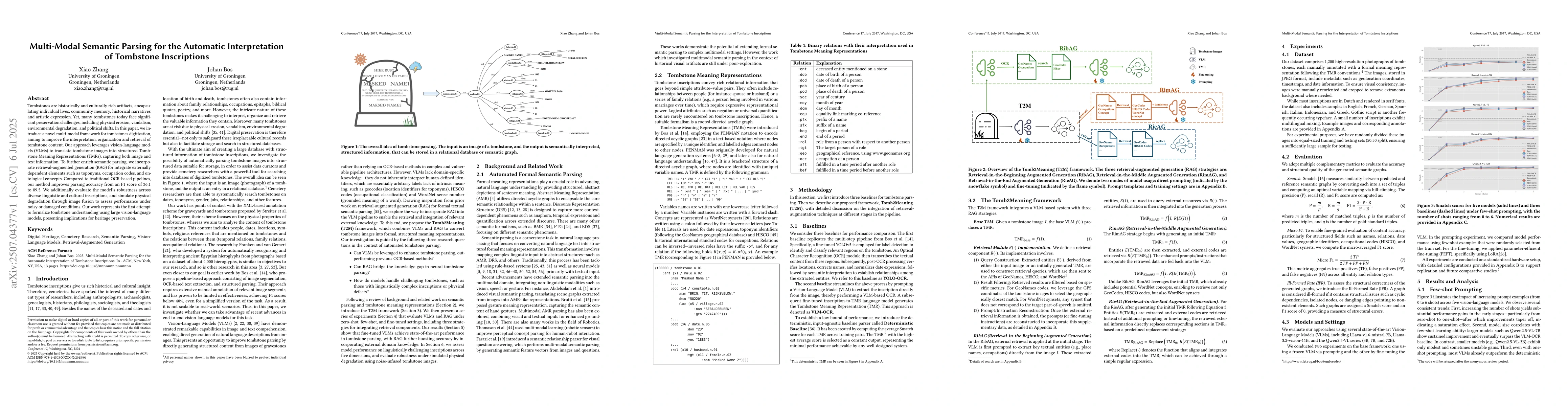 Tombstones are historically and culturally rich artifacts, encapsulating individual lives, community memory, historical narratives and artistic expression. Yet, many tombstones today face significant preservation challenges, including physical erosion, vandalism, environmental degradation, and political shifts. In this paper, we introduce a novel multi-modal framework for tombstones digitization, aiming to improve the interpretation, organization and retrieval of tombstone content. Our approach leverages vision-language models (VLMs) to translate tombstone images into structured Tombstone Meaning Representations (TMRs), capturing both image and text information. To further enrich semantic parsing, we incorporate retrieval-augmented generation (RAG) for integrate externally dependent elements such as toponyms, occupation codes, and ontological concepts. Compared to traditional OCR-based pipelines, our method improves parsing accuracy from an F1 score of 36.1 to 89.5. We additionally evaluate the model's robustness across diverse linguistic and cultural inscriptions, and simulate physical degradation through image fusion to assess performance under noisy or damaged conditions. Our work represents the first attempt to formalize tombstone understanding using large vision-language models, presenting implications for heritage preservation.