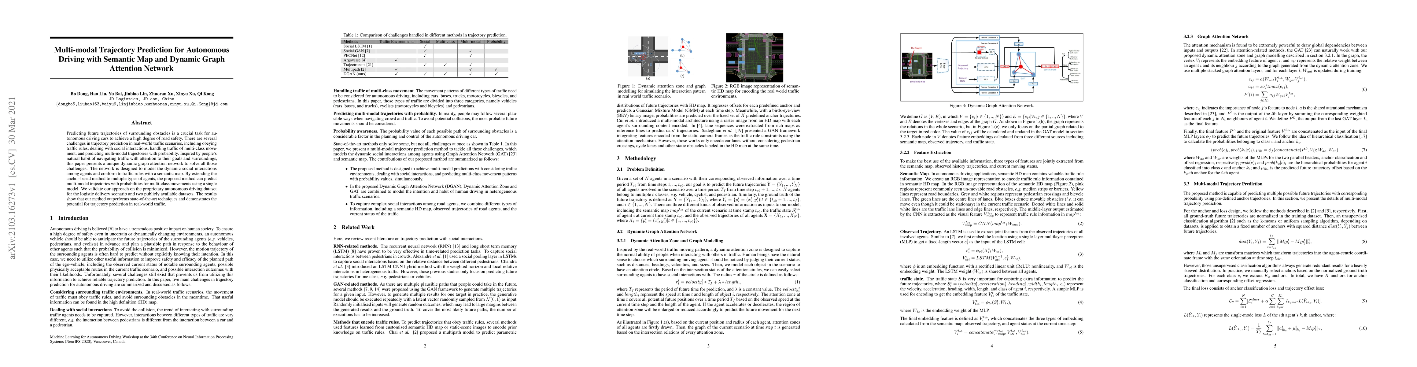 This paper proposes a dynamic graph attention network to predict multi-modal trajectories for autonomous driving vehicles, incorporating a semantic map to model dynamic social interactions and traffic rules. The method outperforms existing techniques in predicting multi-class movements and is validated on proprietary and public datasets.