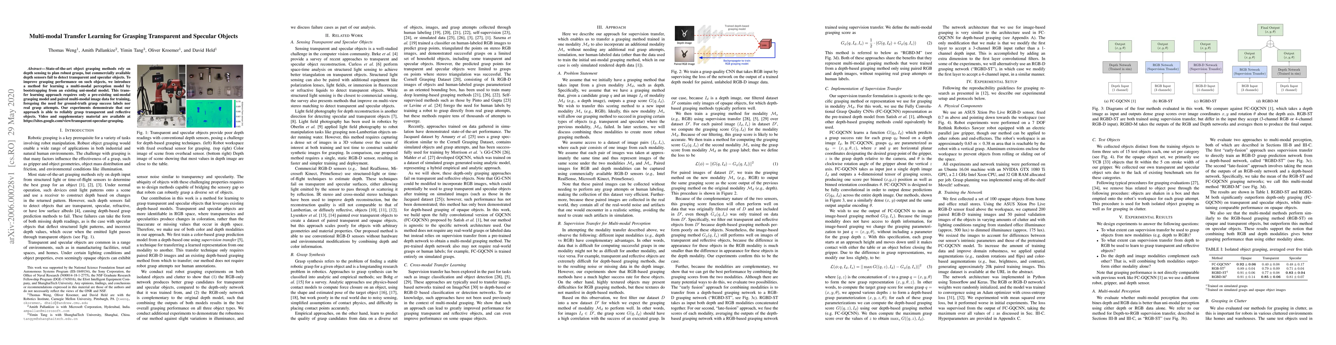 This paper proposes a multi-modal transfer learning method to enhance grasping of transparent and specular objects, leveraging existing uni-modal models without requiring ground-truth labels or real grasp attempts. The approach successfully improves grasping performance for these challenging objects through bootstrapping from paired multi-modal image data.