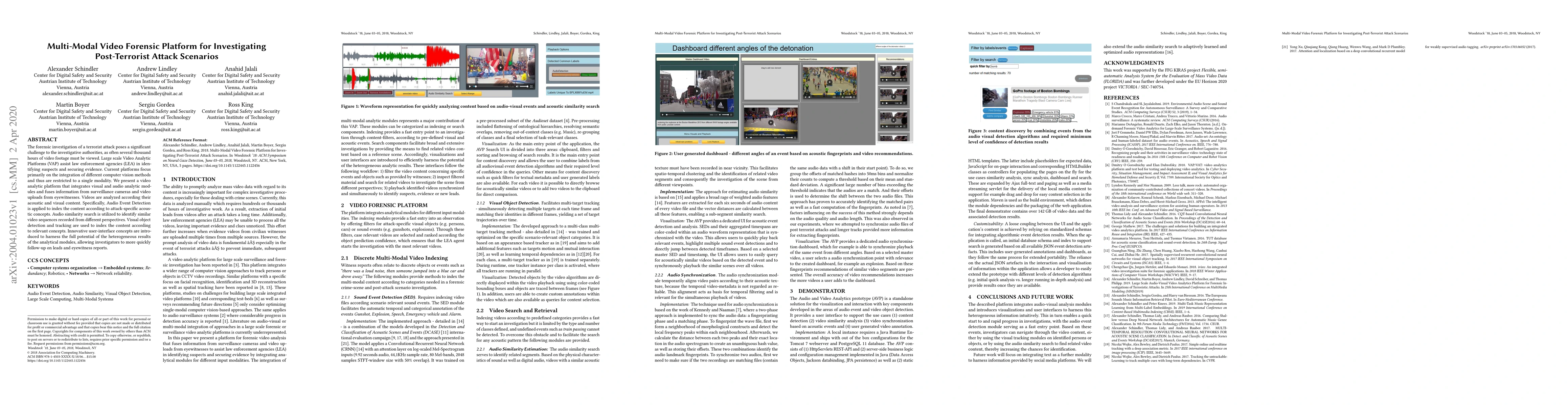 The research presents a Multi-Modal Video Forensic Platform integrating visual and audio analytic modules for investigating post-terrorist attack scenarios. It utilizes Audio Event Detection for indexing content according to attack-specific acoustic concepts and audio similarity search to identify similar video sequences from different perspectives. Visual object detection and tracking are used to index content according to relevant concepts.