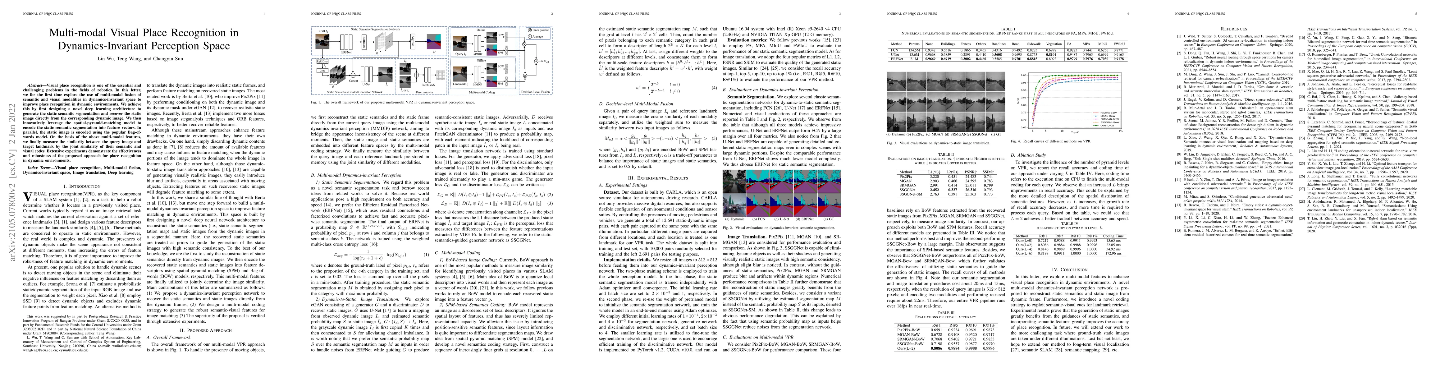 This paper proposes a novel deep learning architecture for multi-modal visual place recognition in dynamic environments, combining semantic and visual modalities. It uses a spatial-pyramid-matching model and Bag-of-words model to encode features, demonstrating improved robustness and effectiveness in place recognition.